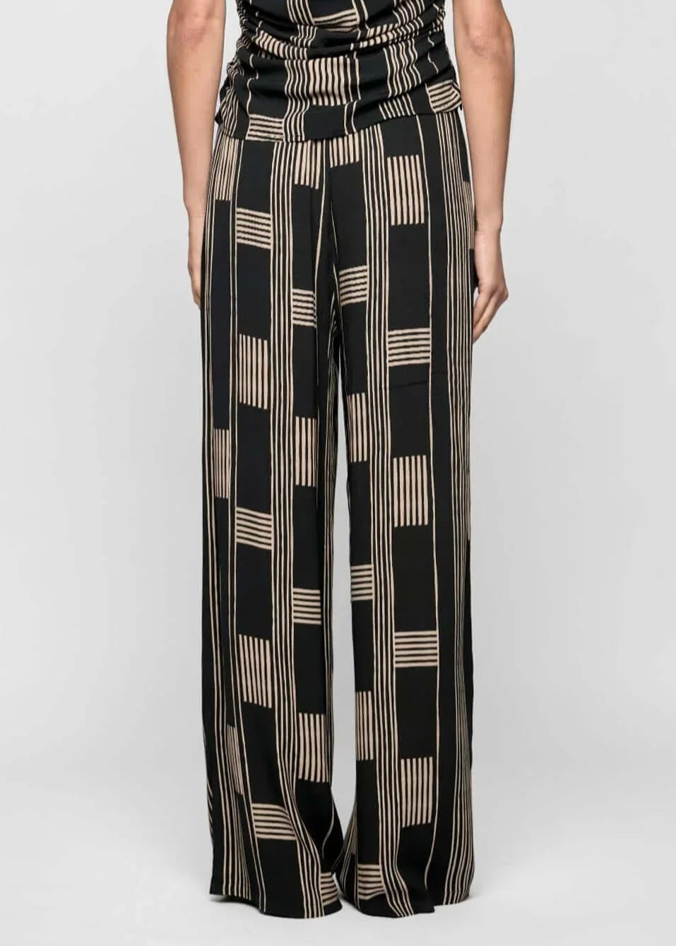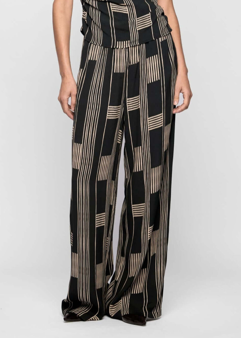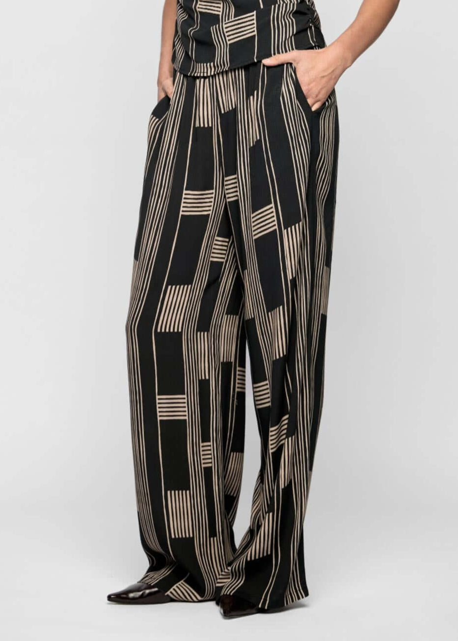 Slip into effortless style with these wide-leg trousers featuring a graphic black and beige print and a comfy adjustable waistband.