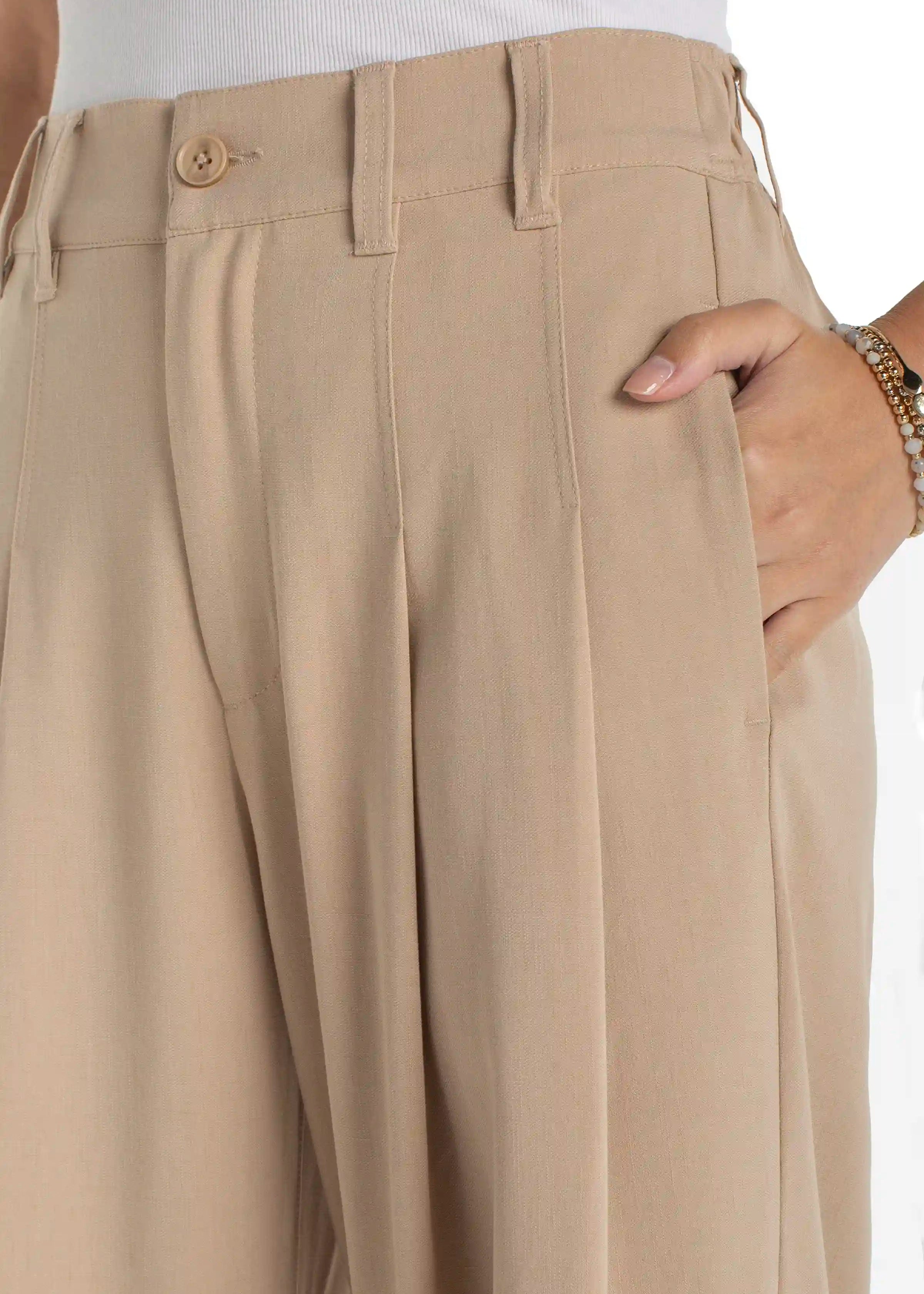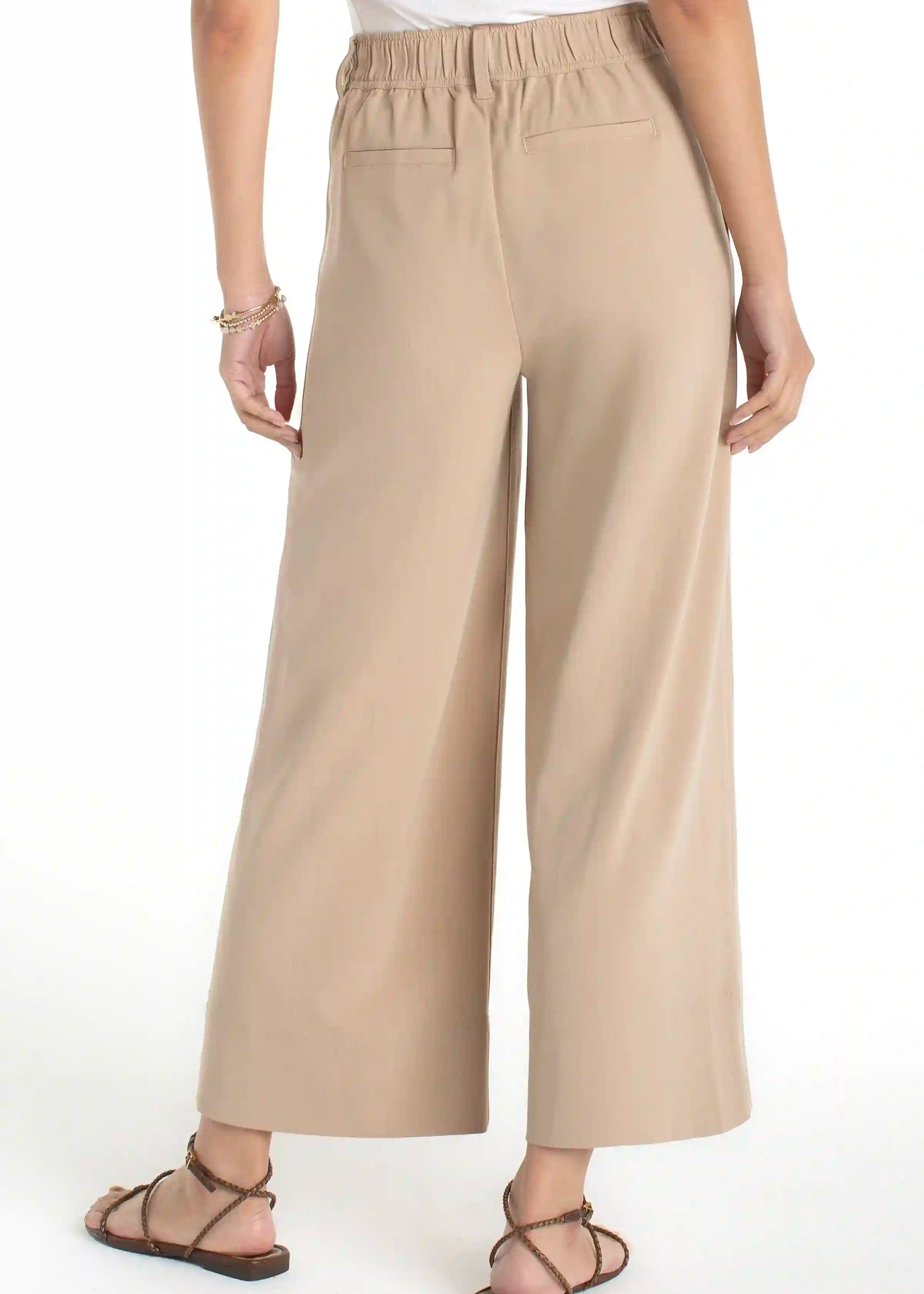 A modern cropped wide-leg trouser designed with soft pleat detailing for added shape and movement. The fluid silhouette creates a flattering, elongating fit, while the elastic back waistband offers all-day comfort with tailored polish. Refined, versatile, and easy to dress up or down.