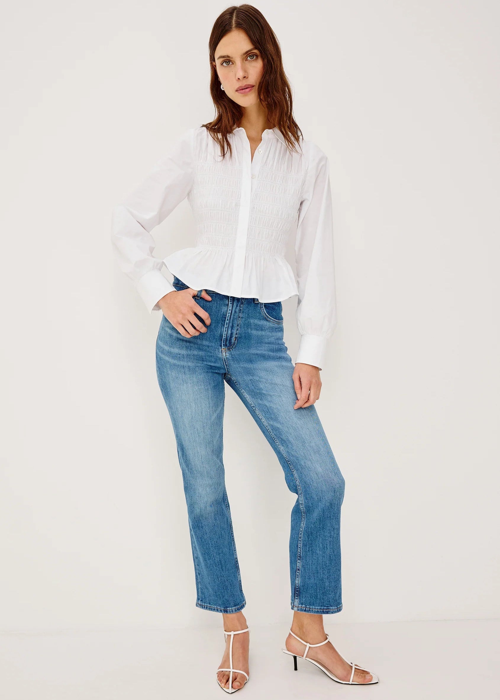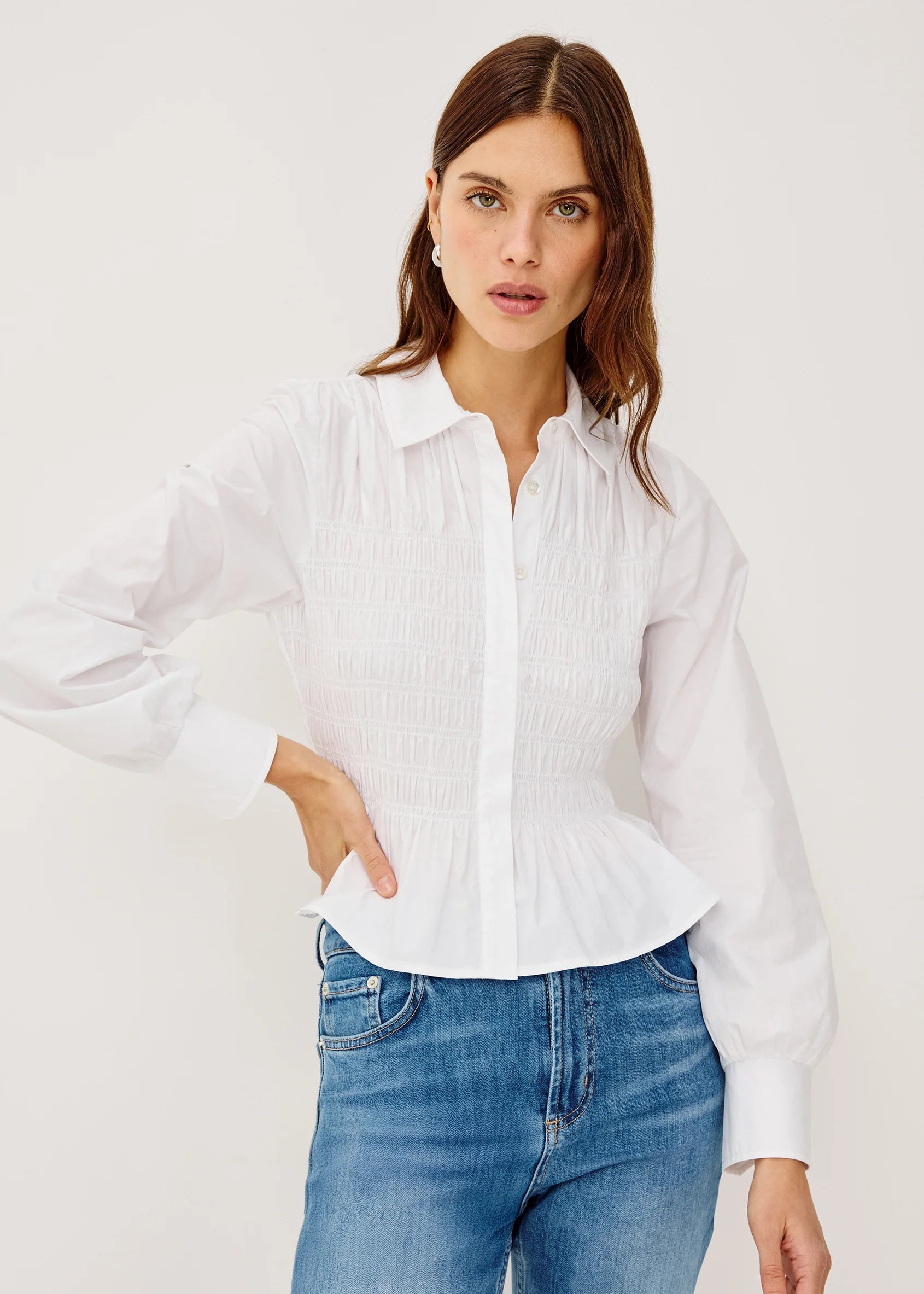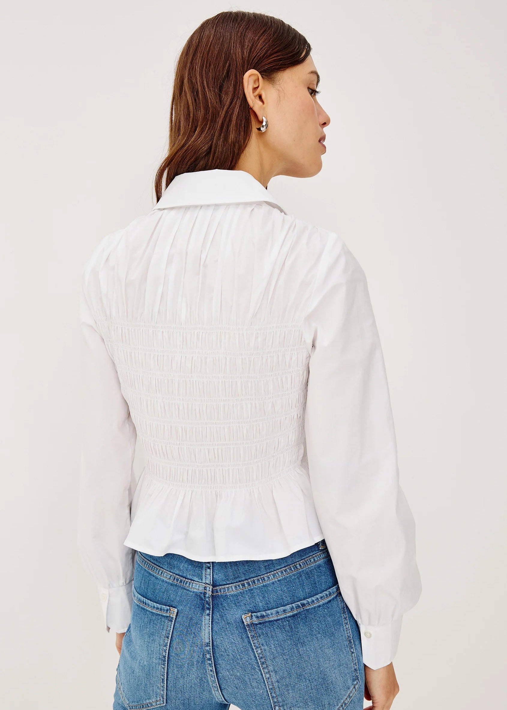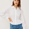 A button-up shirt that shapes, the Bradshaw is crafted from crisp cotton poplin with a classic collar, smocked body, peplum hem, and long gathered sleeves.