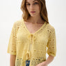 Light and easy in open-stitch knit, this viscose poly cardigan features a V-neckline and short sleeves for warm-weather layering. Finished with front self-ties and a JR metal coin, it balances casual style with subtle detail.