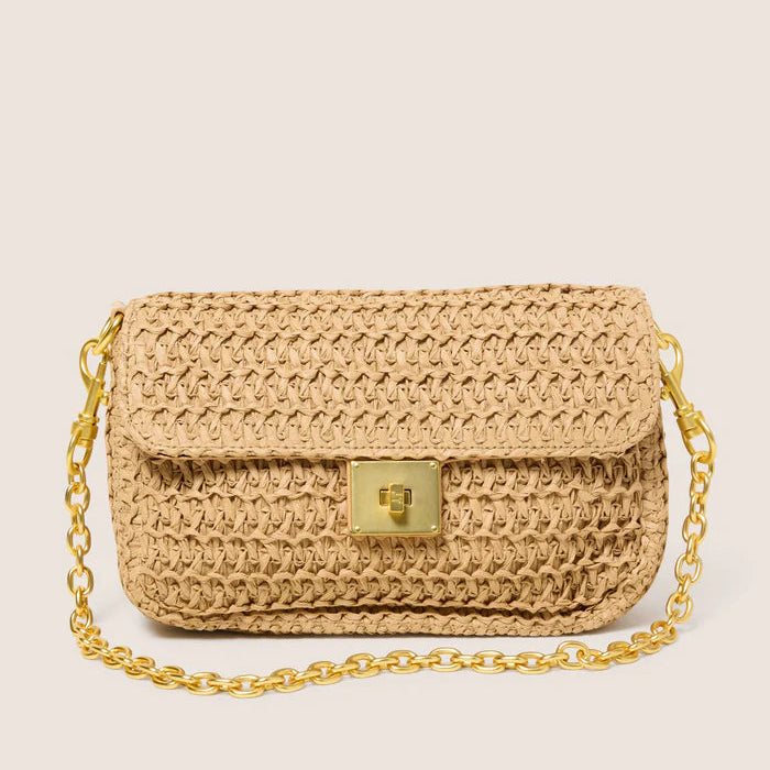 The Think Royln High Society bag is a must-have warm-weather accessory, featuring a textured raffia exterior and clasp closure. Wear it on the shoulder with the detachable chain strap, or go hands-free with the detachable, adjustable crossbody strap.