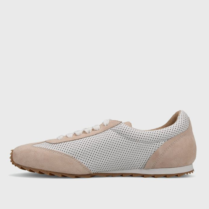 Perforated leather lace-up fashion sneaker. Padded heel collar. Padded removable insole. .25 inch treaded rubber sole.