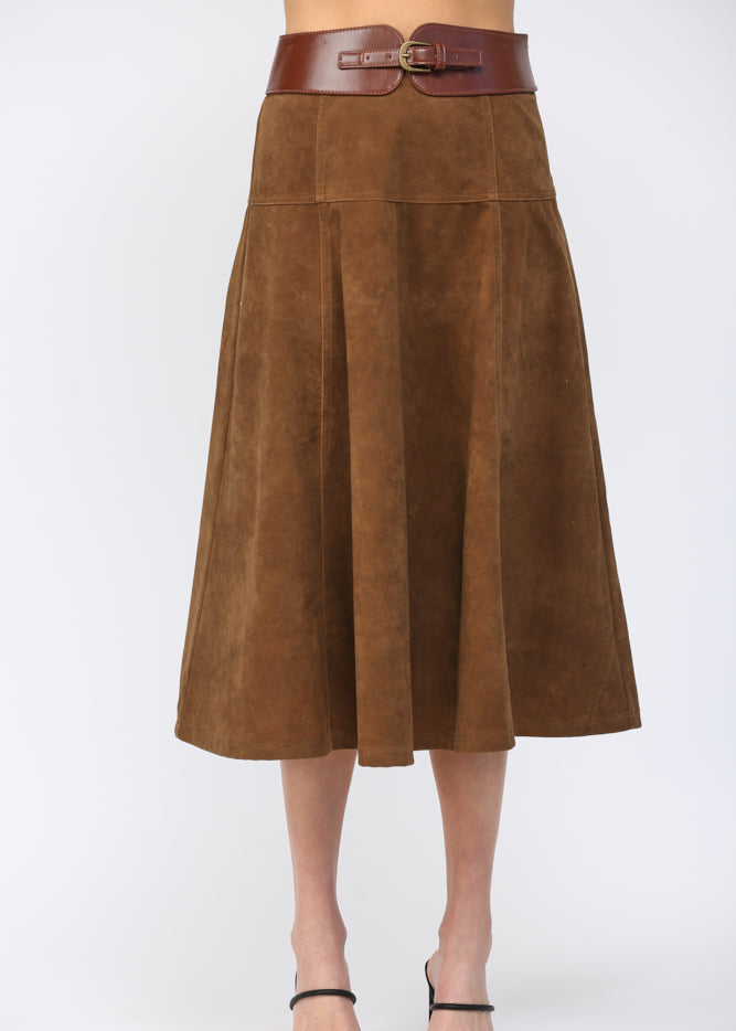 WIDE HIGH WAISTED BELT DETAIL A-LINE FAUX SUEDE MIDI SKIRT