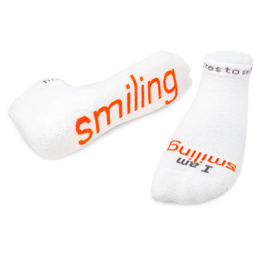 'I am smiling' white socks with neon orange words. High quality athletic socks with arch support and breathable mesh.