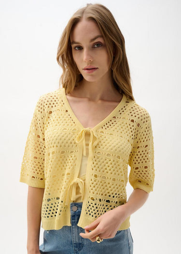 Light and easy in open-stitch knit, this viscose poly cardigan features a V-neckline and short sleeves for warm-weather layering. Finished with front self-ties and a JR metal coin, it balances casual style with subtle detail.