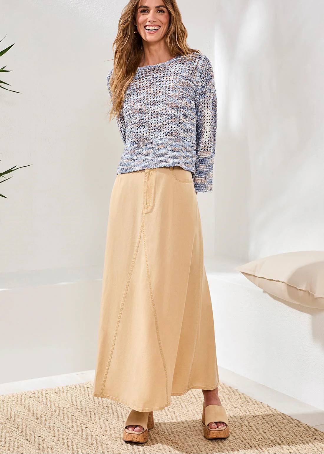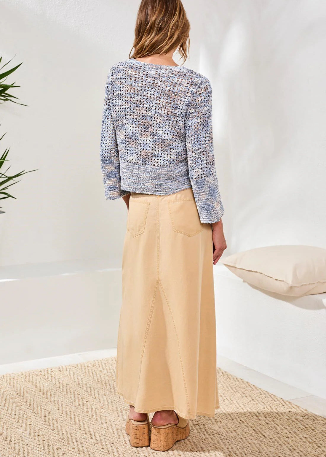 The bell sleeve open stitch crew neck sweater is knit from multi-color tape yarn for airy texture and style. The relaxed fit, open stitch design, and statement sleeves create a contemporary look that’s lightweight and perfect for cool spring layering.