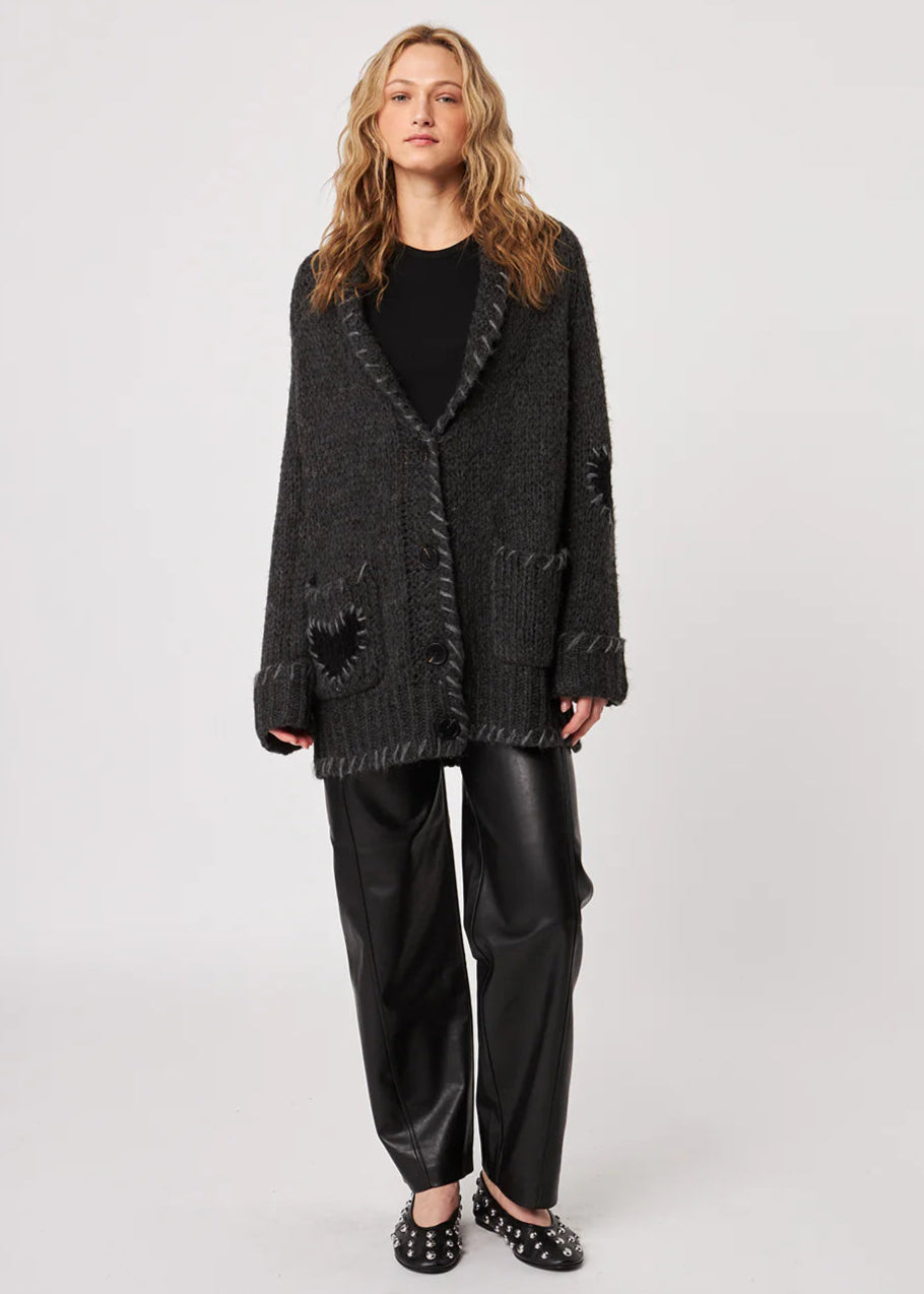 Grunge meets comfort in The Tripp Cardigan, a slouchy, oversized layer with a lived-in edge. Crafted from a soft, textured knit in washed black, it features raw-edge details, front patch pockets, and a button-down front. Its effortlessly undone vibe makes it the perfect throw-on for cooler days or laid-back layering.