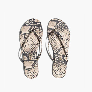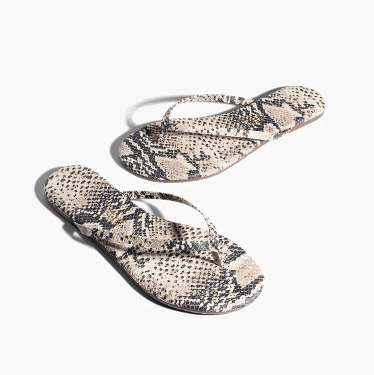 A snakeskin print on the style that started it all. Handcrafted from soft leather like material in a classic flip flop style. Love right out of the box; we added a cushioned insole and rubber outsole for extra comfort.