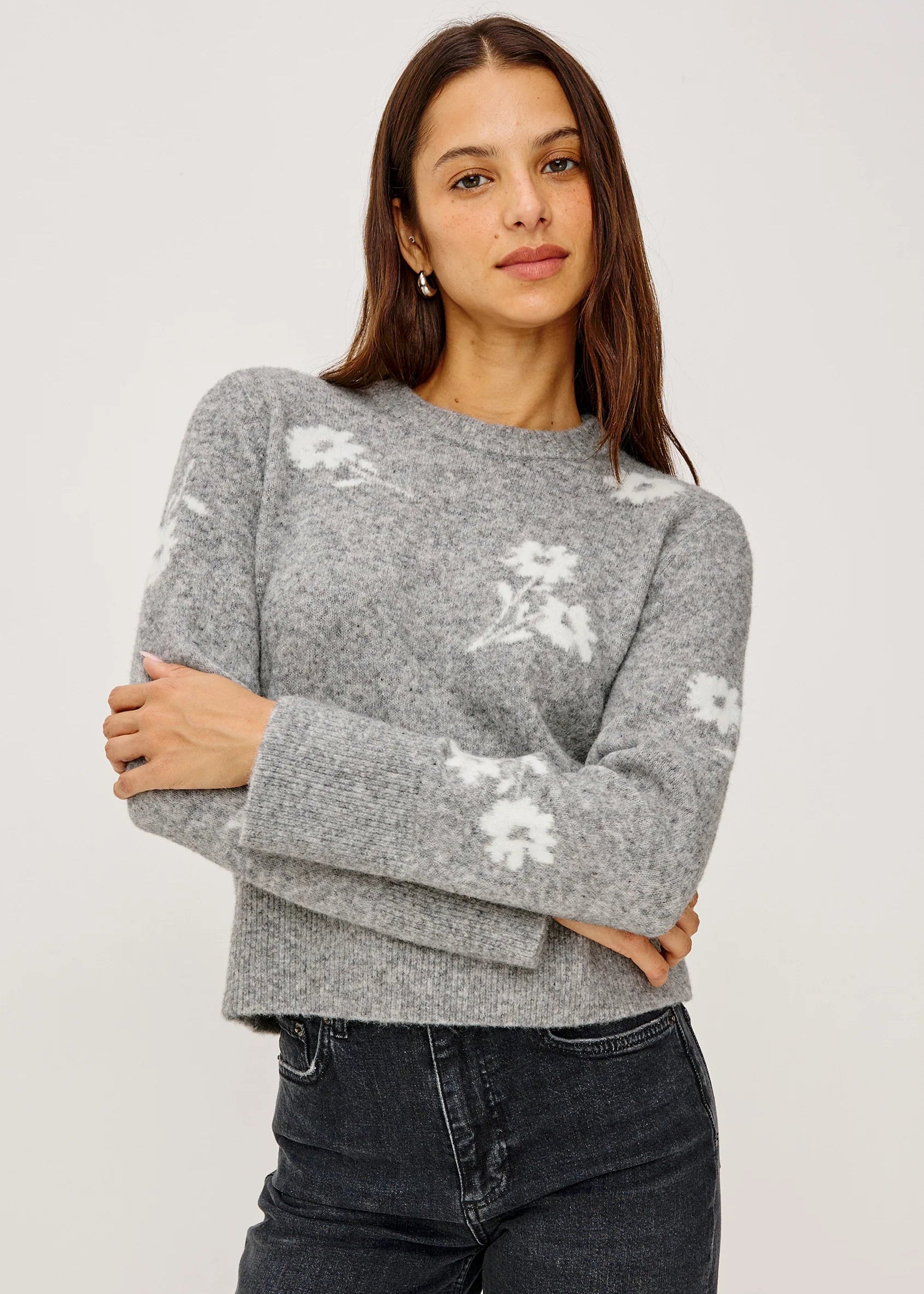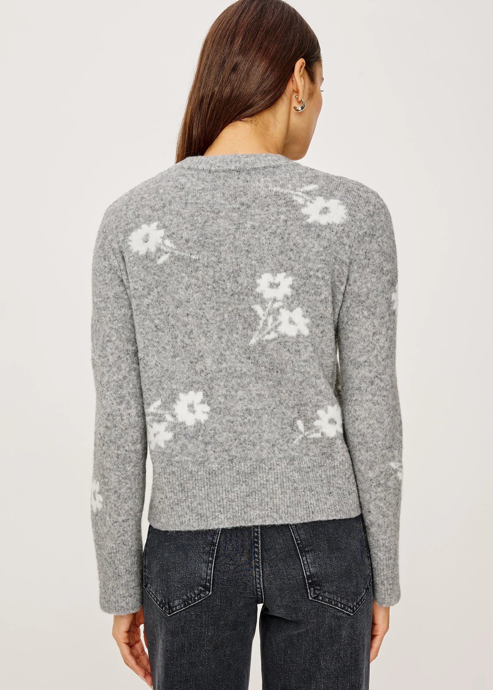 The Anise sweater exudes feminine charm with vintage-inspired contrast floral motifs. Knitted from a cozy wool blend, it features a classic crew neckline, long sleeves, and a relaxed, boxy fit.