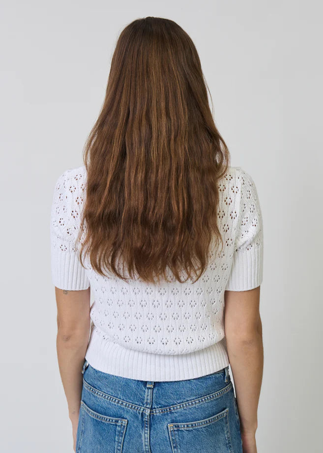 This knit top showcases an intricate pointelle pattern for a breathable, textured feel. Short sleeves and a ribbed hem create a structured, flattering silhouette, while a delicate collar and contrast front placket add vintage charm with a modern twist.