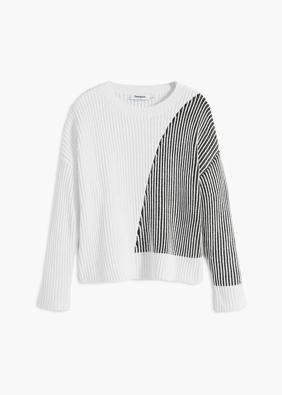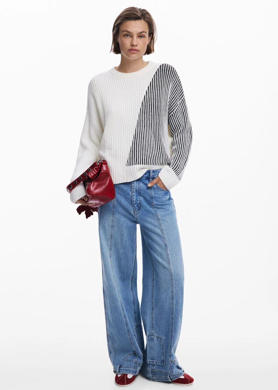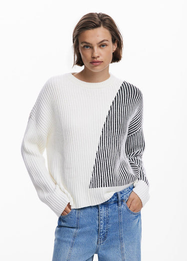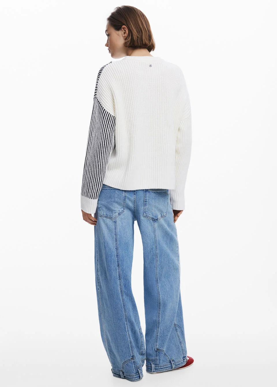 Turtleneck sweater with long sleeves and combined fabrics in solid color and striped print.