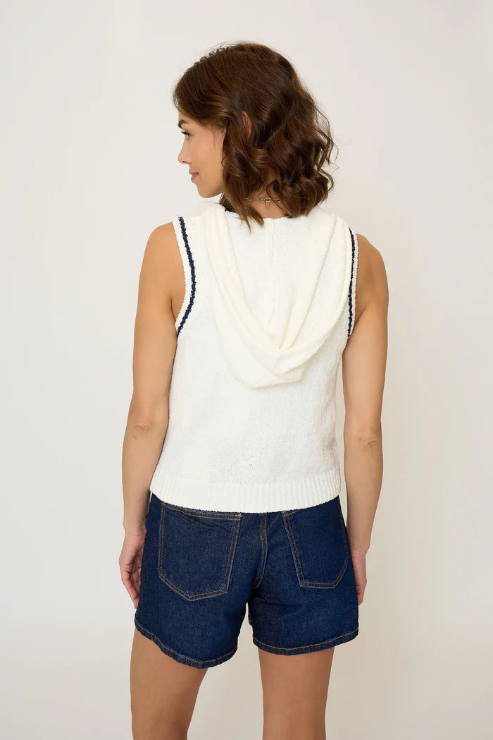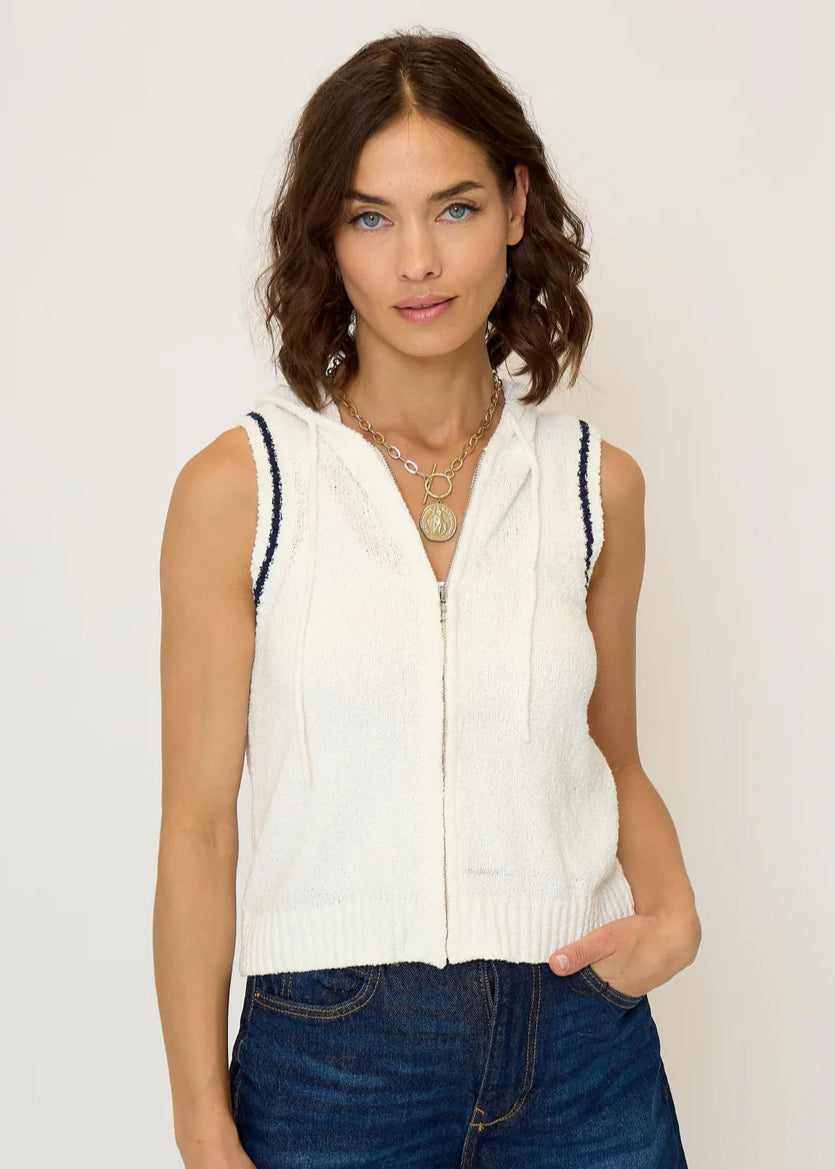 This sleeveless knit shell features a practical zip-up front and a cozy hood.