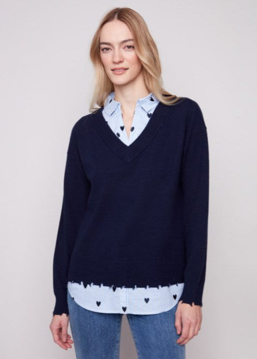 V-Neck Fooler Sweater with Embroidered Poplin Shirt Collar