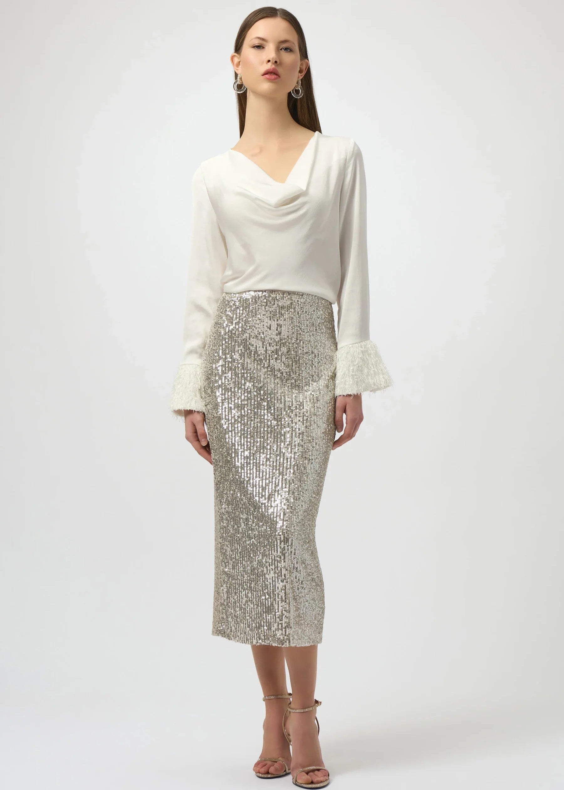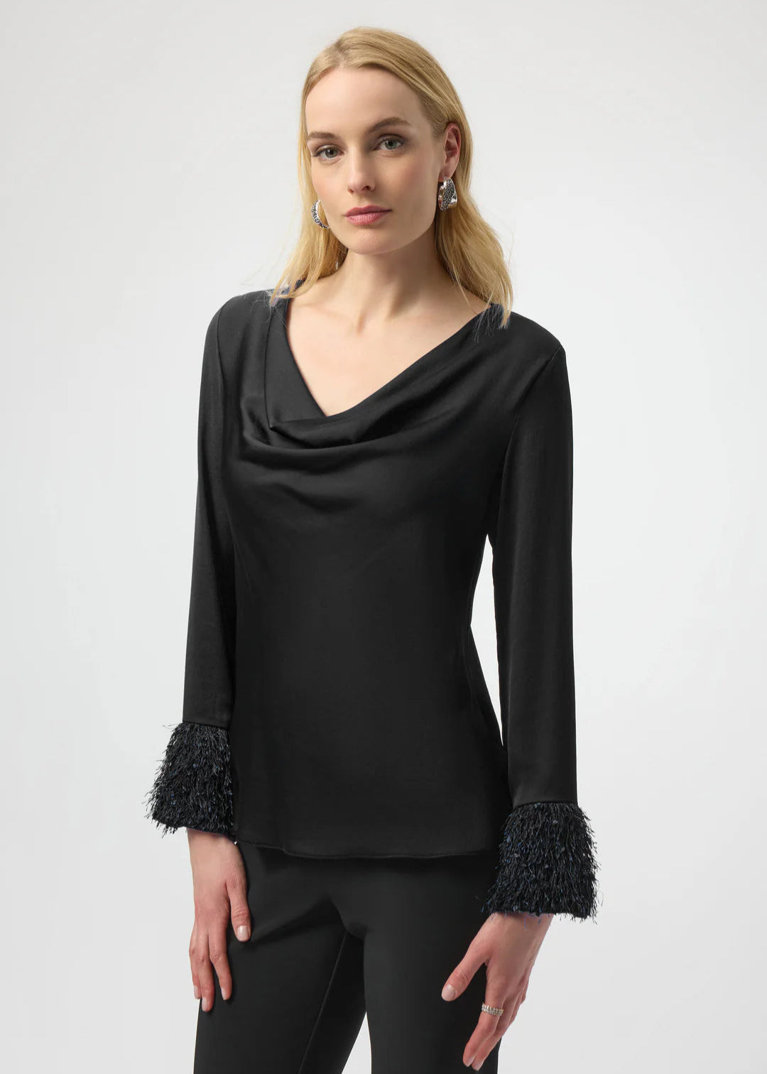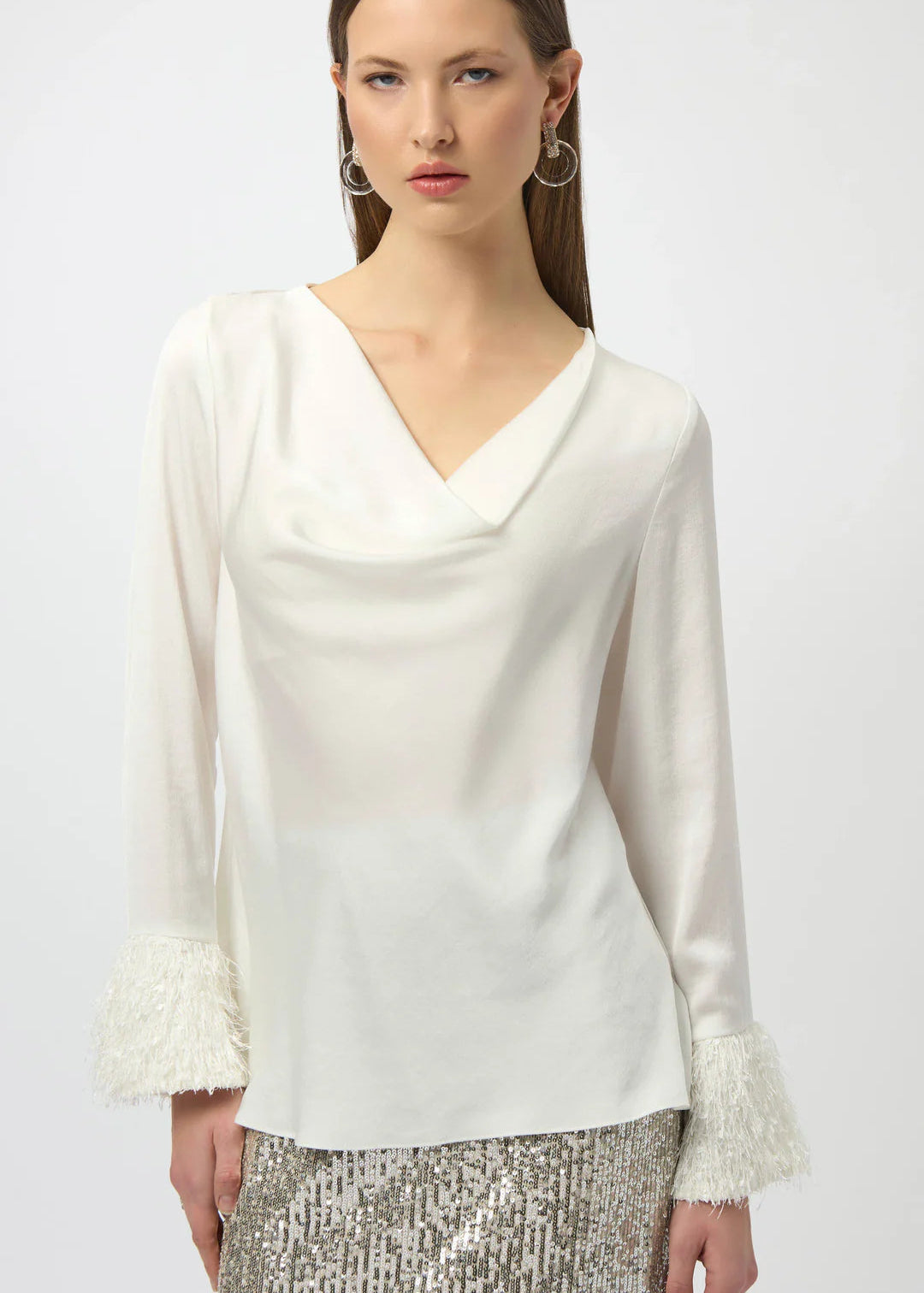 Crafted from recycled hammered satin, this charming top features a straight silhouette that is beautifully enhanced by a graceful cowl neck. Long sleeves with unique cuffs and slit details bring a stylish twist to the classic design.