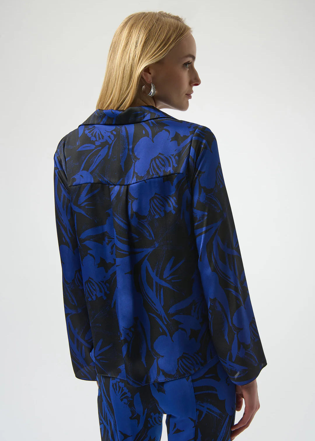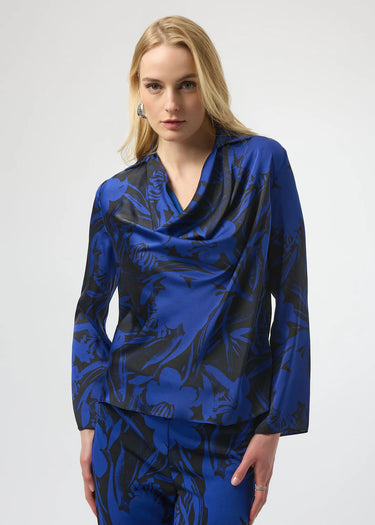 This Joseph Ribkoff satin top features a refined floral print and an elegant cowl neck, creating a sophisticated statement piece. Its long, straight sleeves and streamlined silhouette provide a flattering fit, making it an ideal choice for both formal and stylish casual occasions.