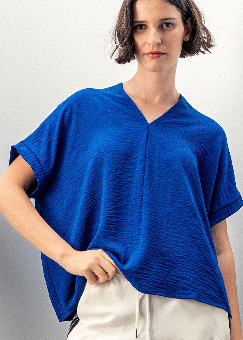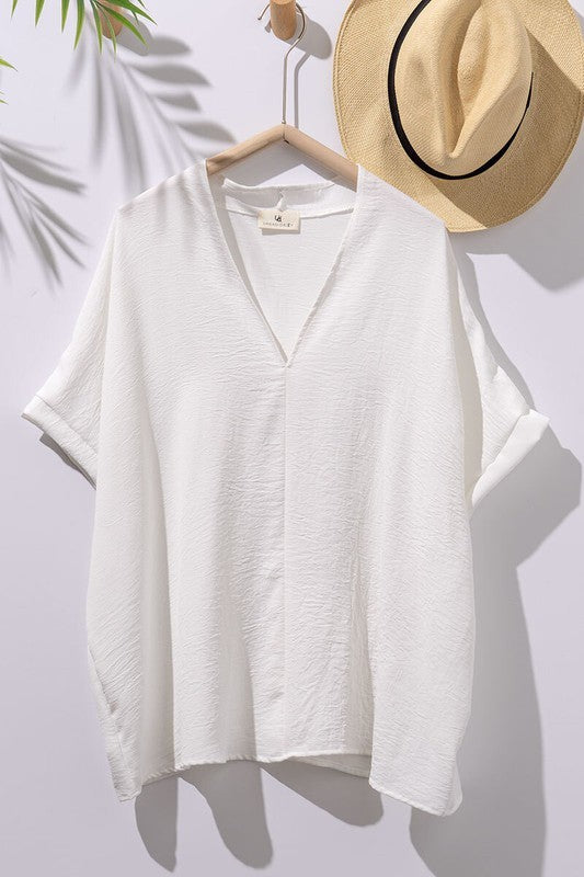 Transform your spring collection with this breezy airflow woven top featuring a deep V-neckline and relaxed silhouette with cuffed sleeves, complemented by a subtle textured finish that is suited for elevated warm-weather styling.