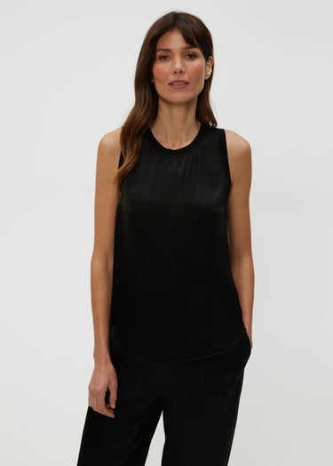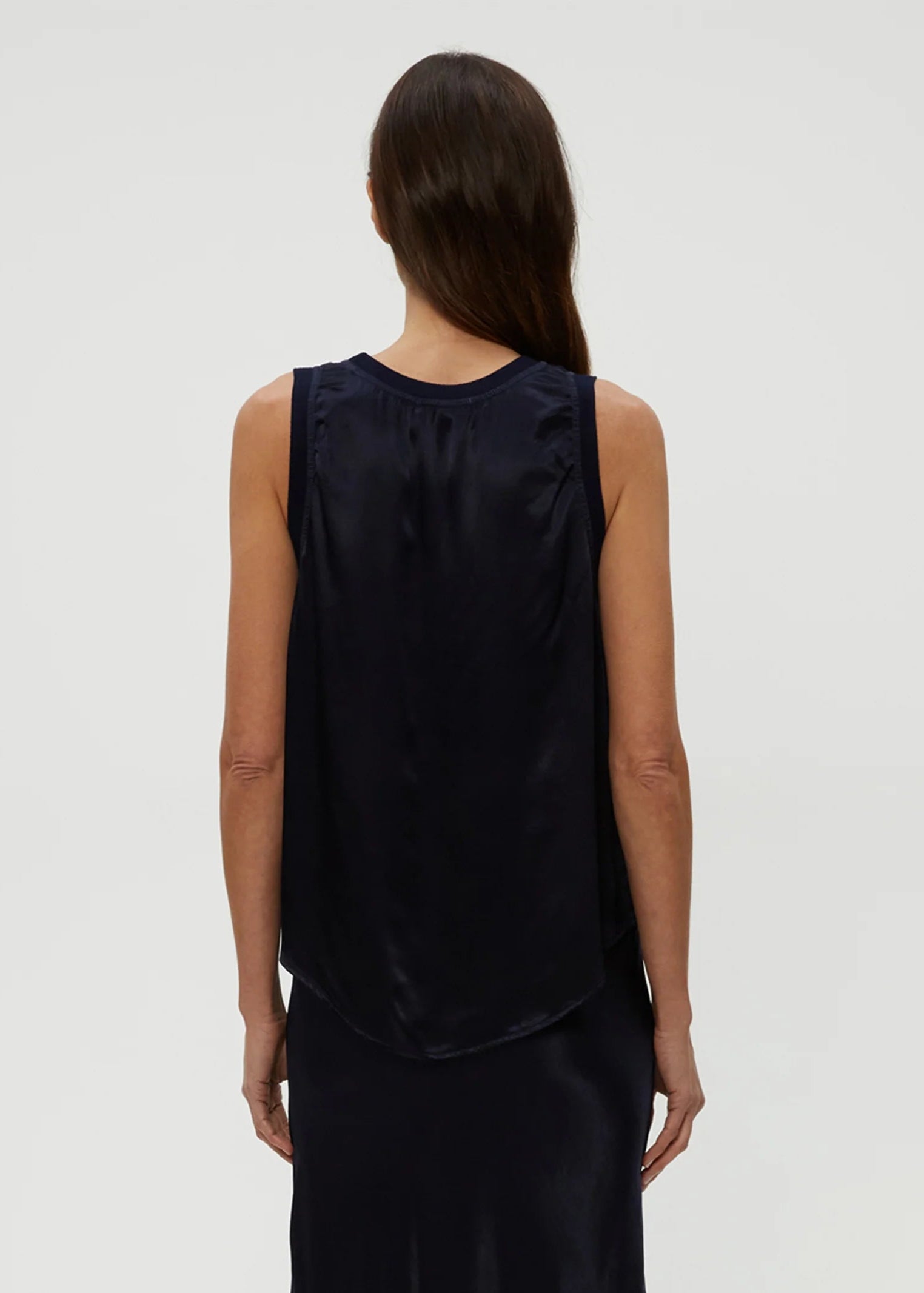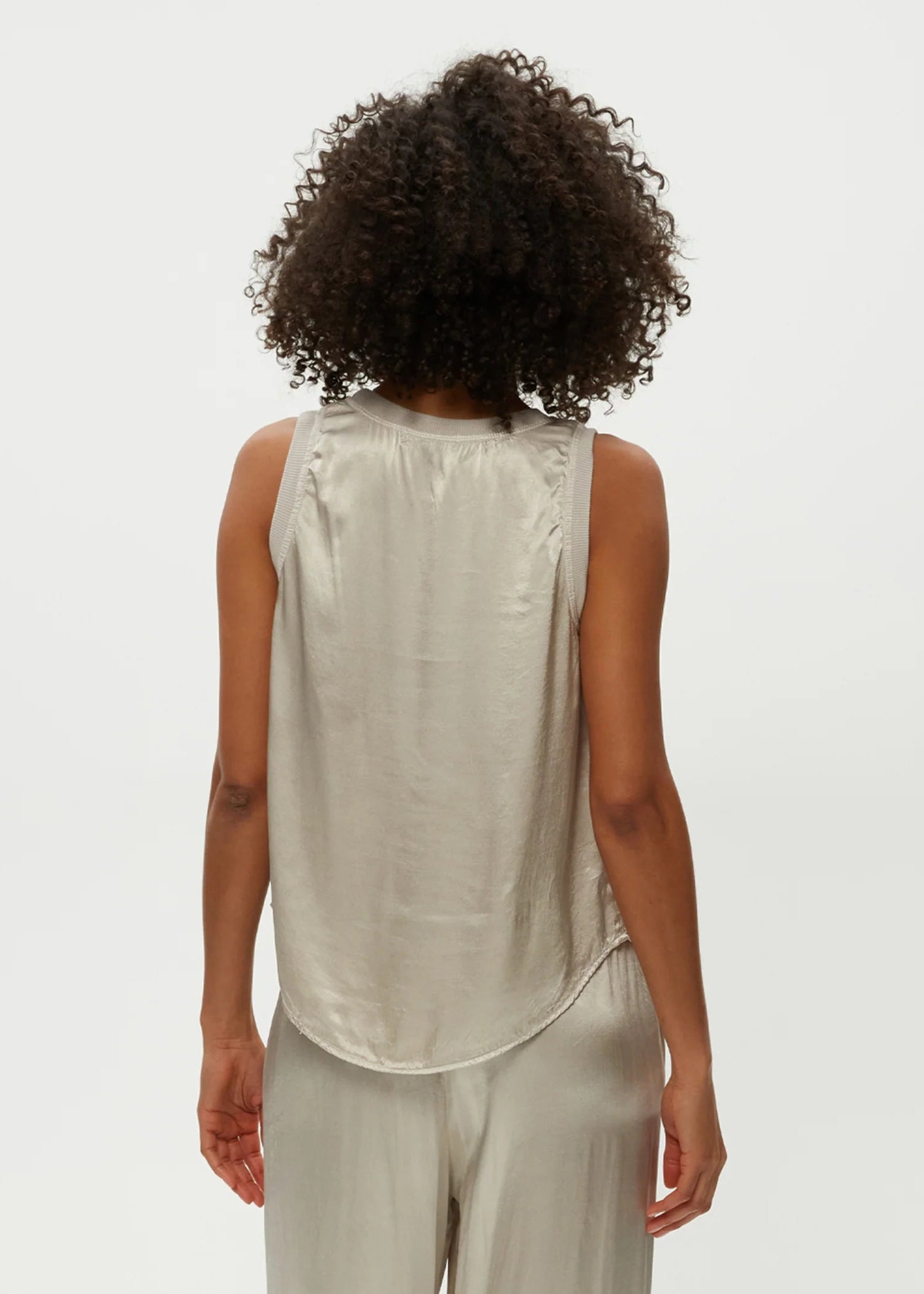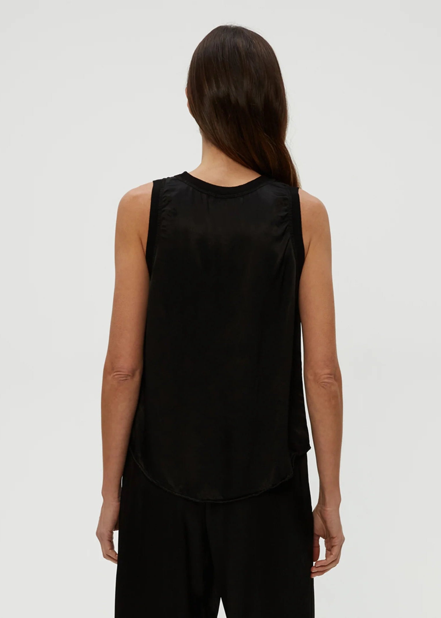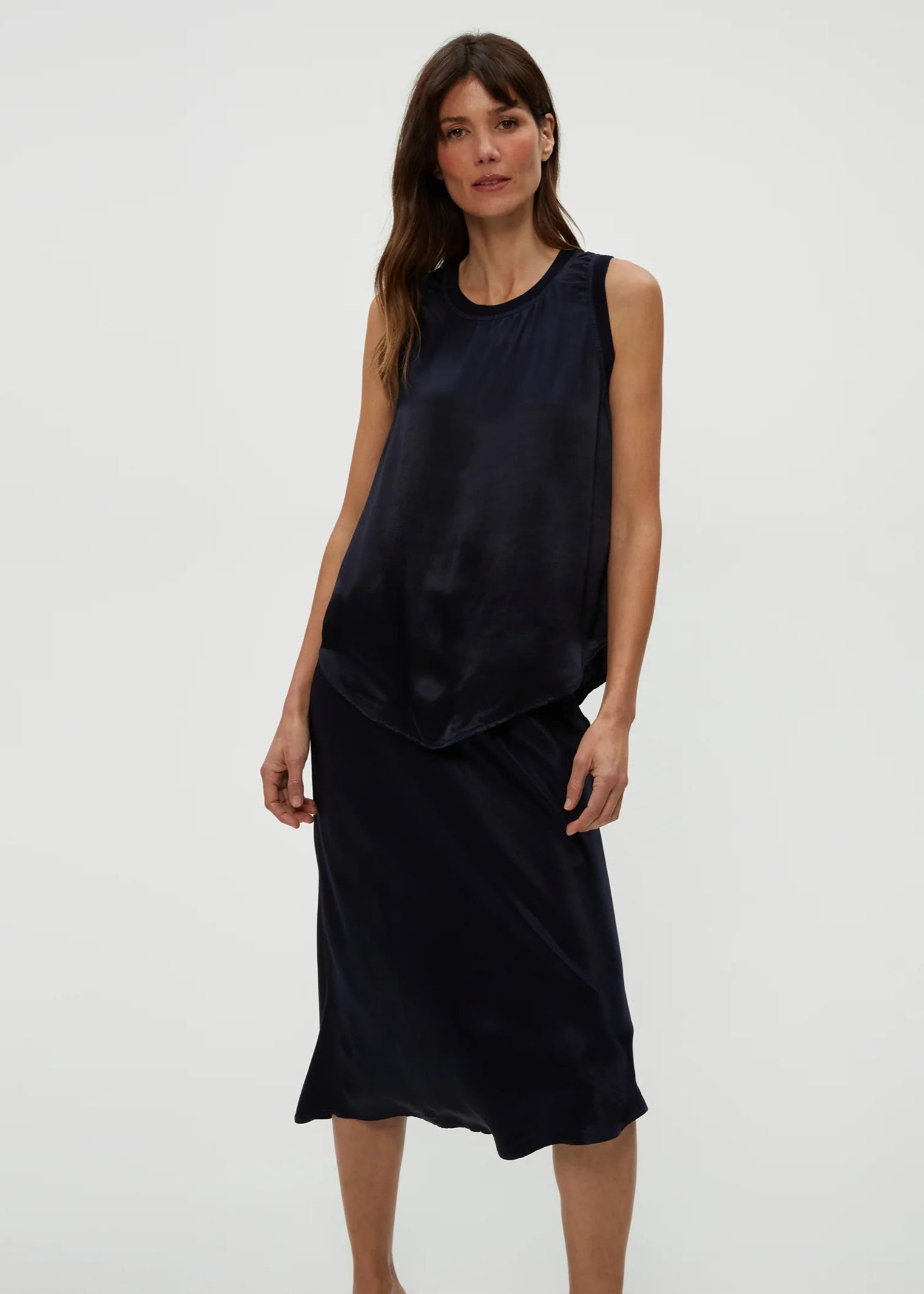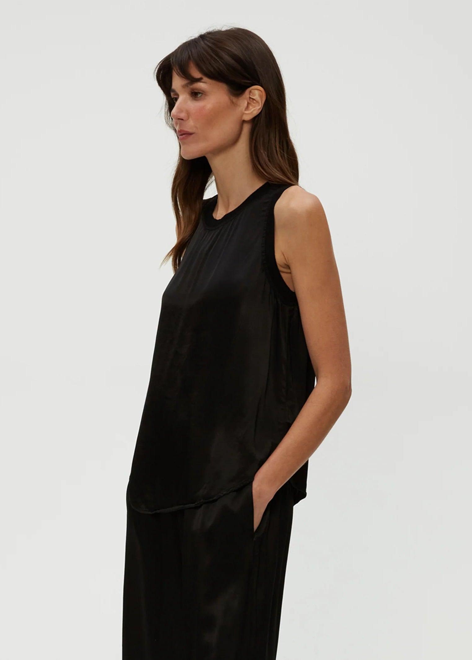 Shay is perfect to take you from day to night. Made-in-LA satin drapes beautifully for a flattering, loose fit with ribbed details and a curved hem.