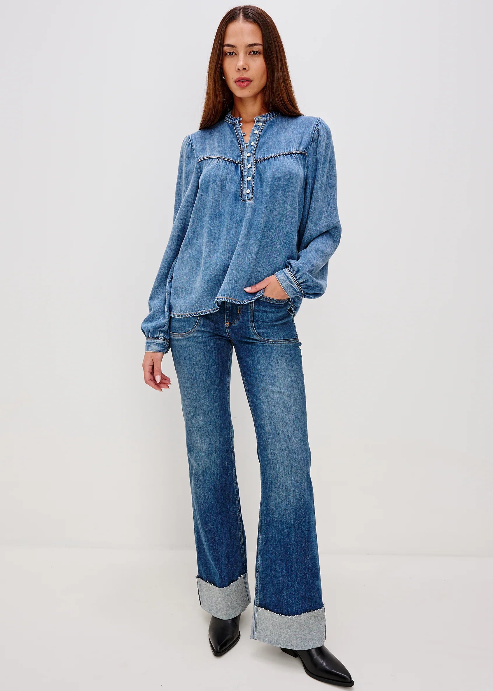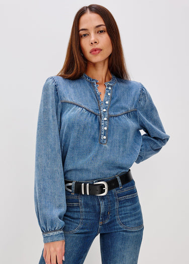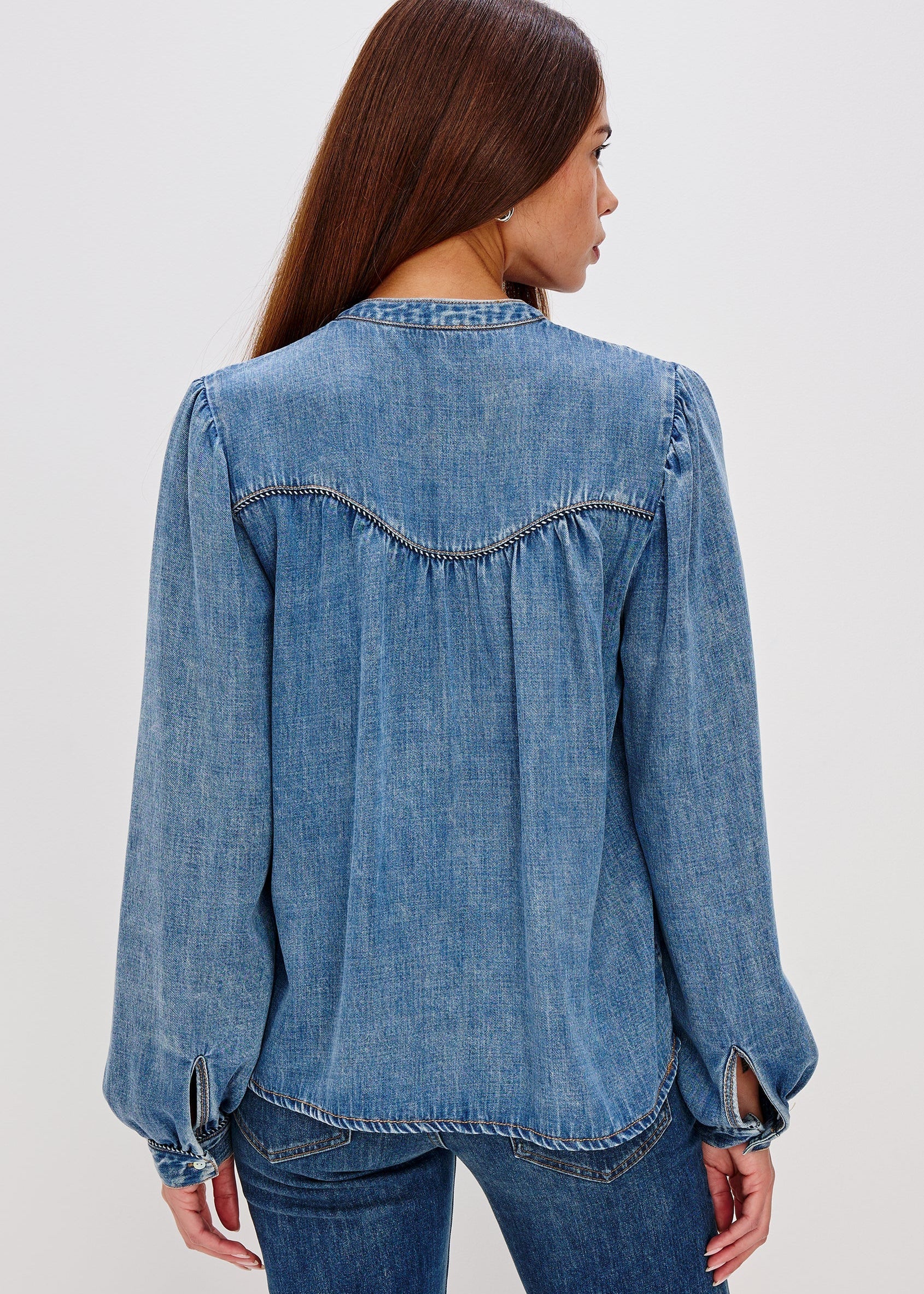 The Sunna is a timeless denim shirt with a lived-in wash. It features a half front placket with shell buttons, two-toned twist piping, a high neckline, and long puff sleeves with fitted cuffs.