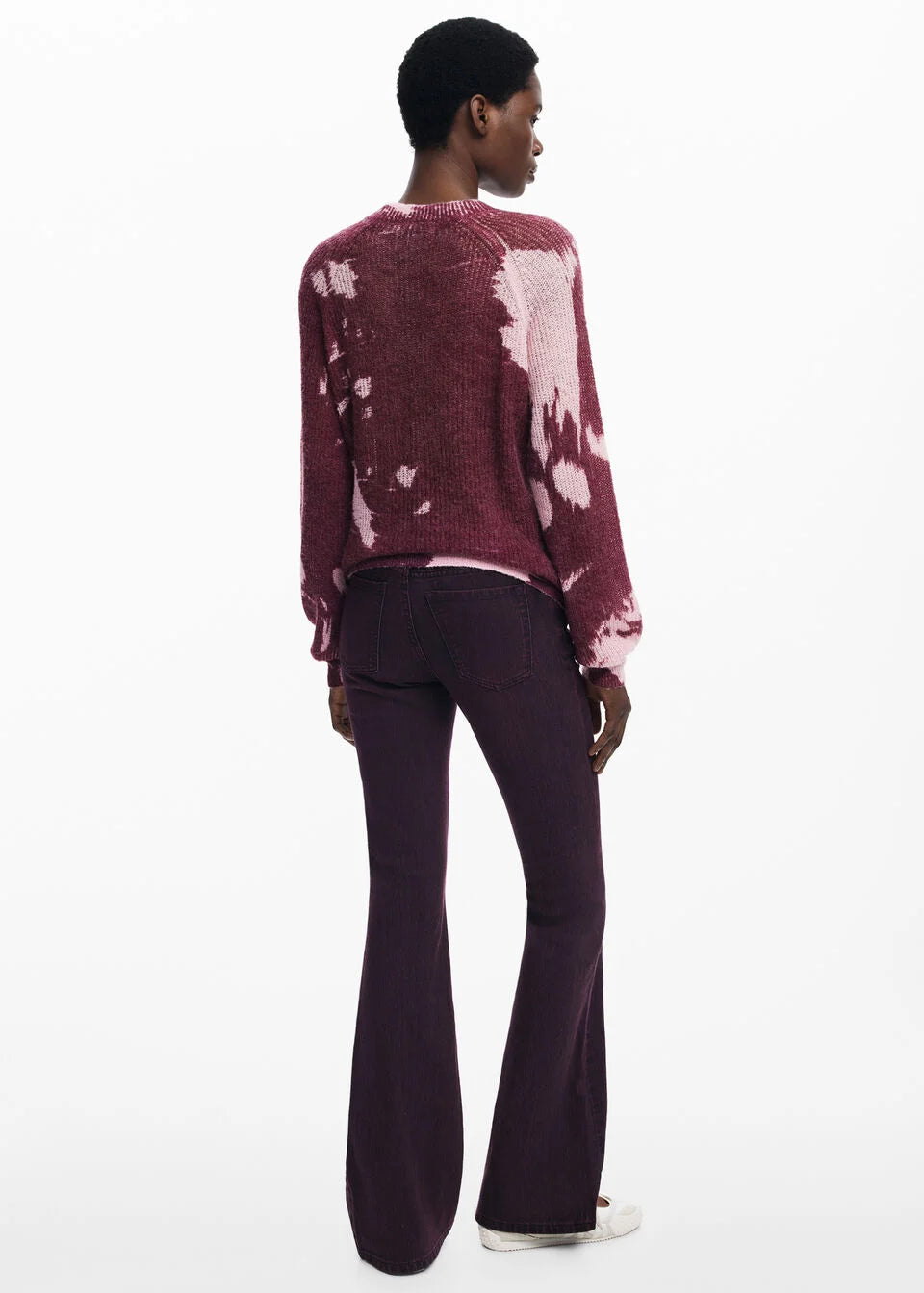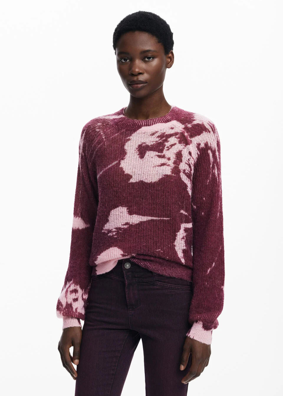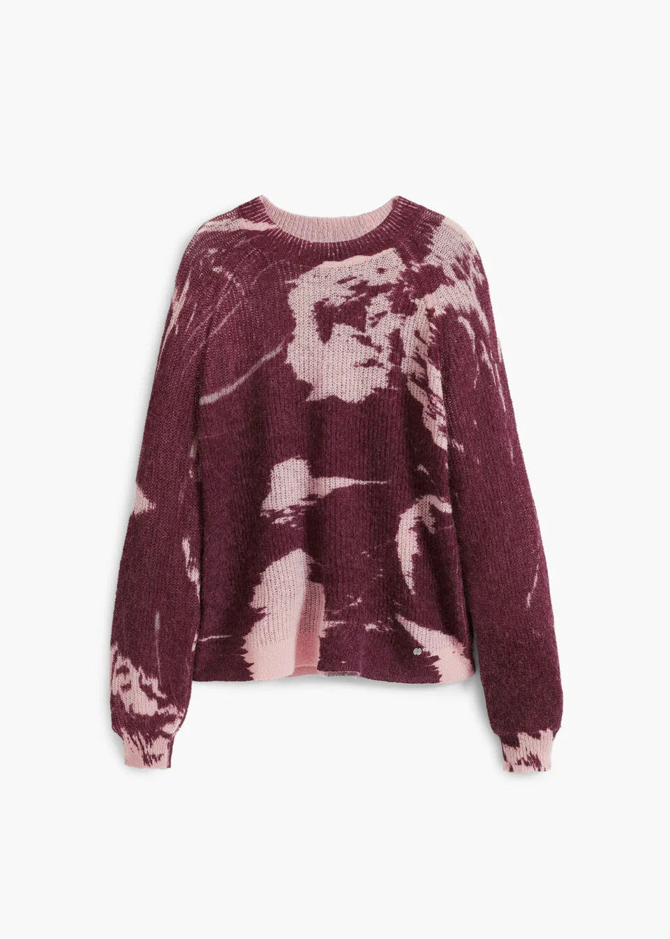 Textured sweater with a round neck, long raglan sleeves, and a sinuous shapes print.