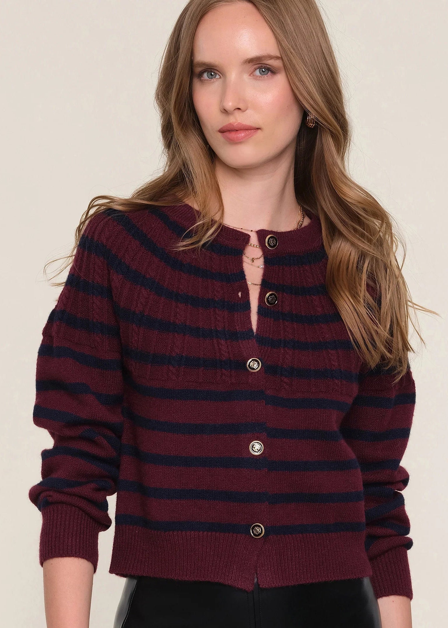 The Selene Cardigan is a crew neck, relaxed fit knit. It features a stripe layout with a cable stitch detail around neck. It also has cute, novelty buttons.