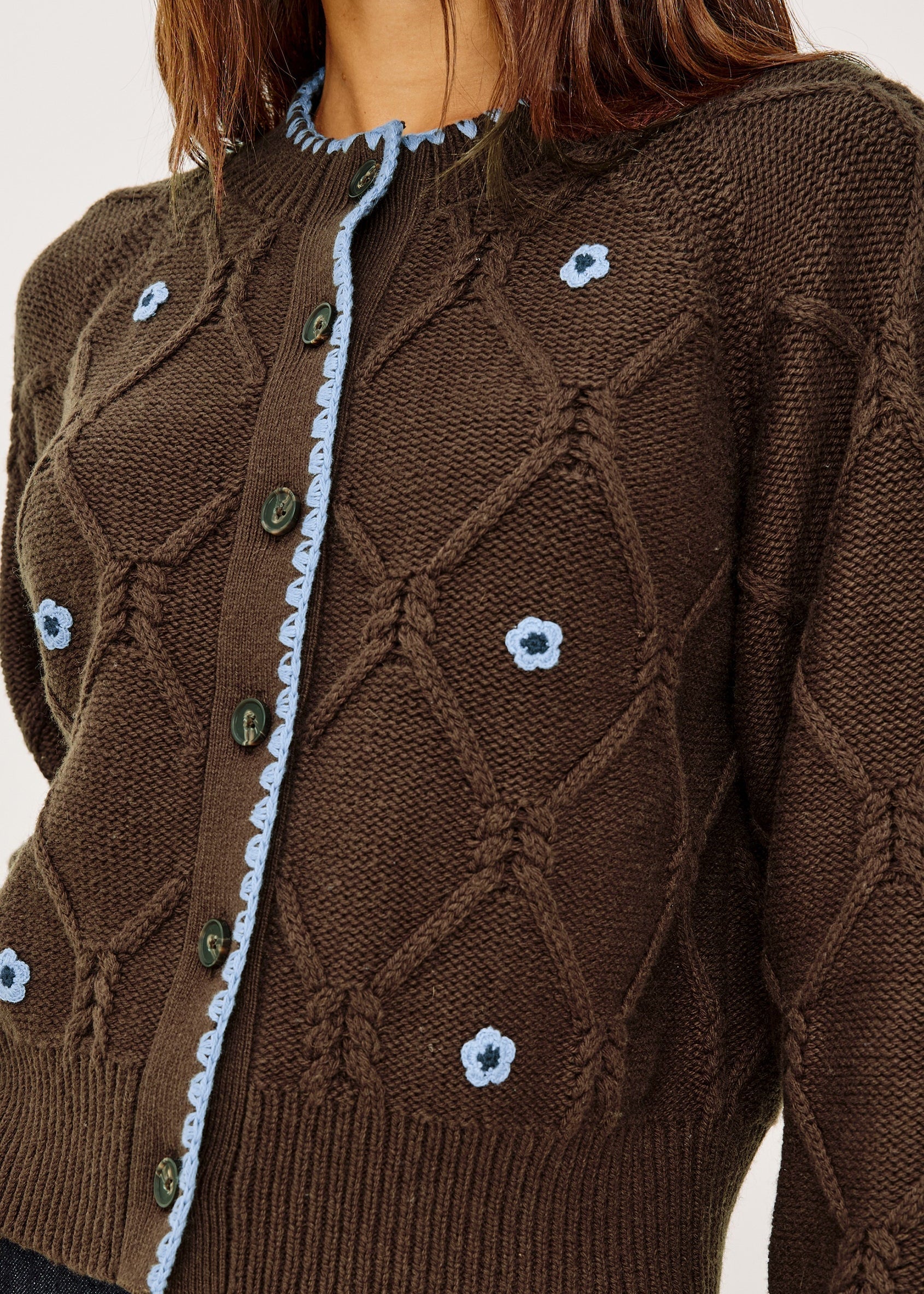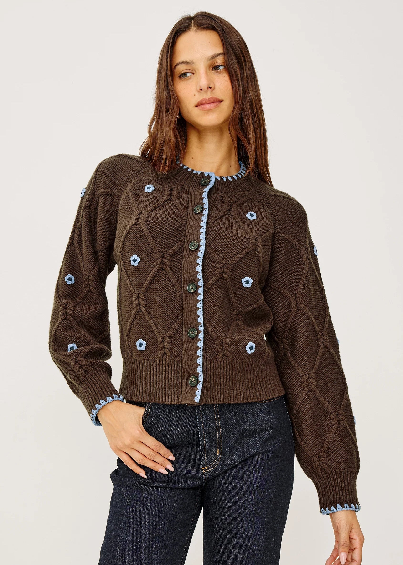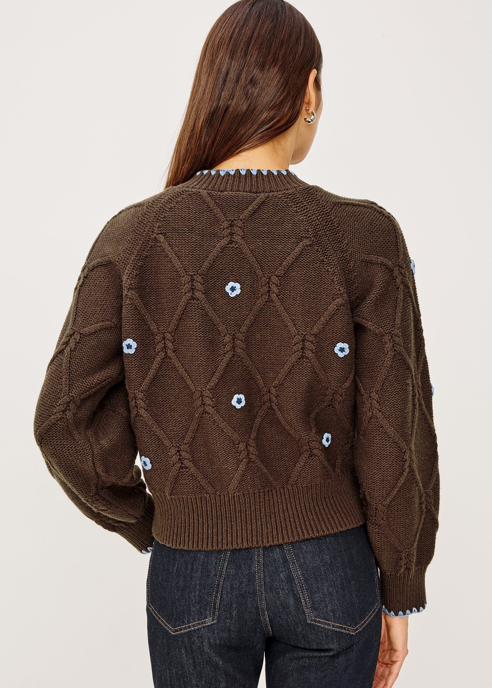 Grounded in classic design, elevated with personality. The Laurie is designed in a luxe cable knit with diamond detailing and embroidered florals. Contrast blanket stitching at the collar, front, and cuffs adds definition, while the relaxed fit keeps it timeless yet contemporary.