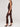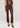 Walnut is a warm deep brown, coated denim. It features black oxide hardware, tonal stitching, raw hem and a black back patch.
