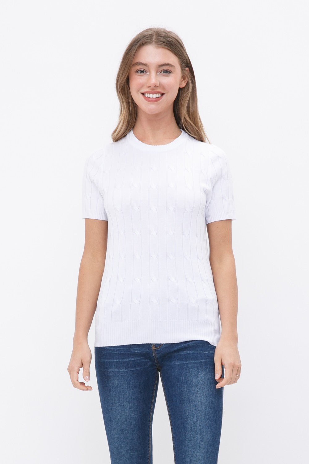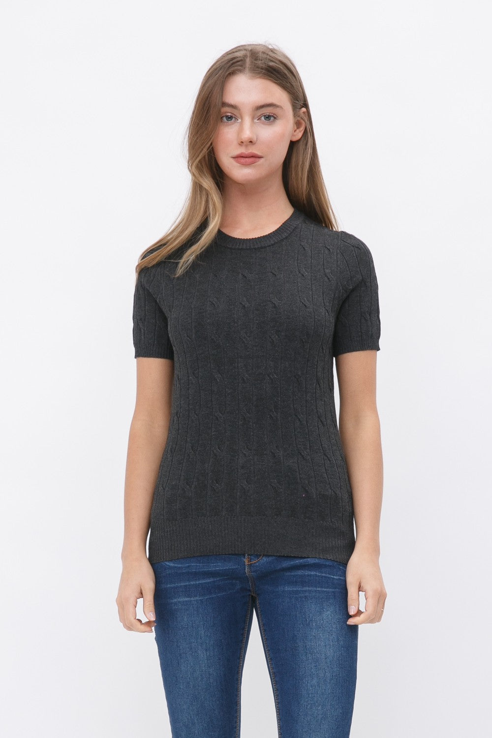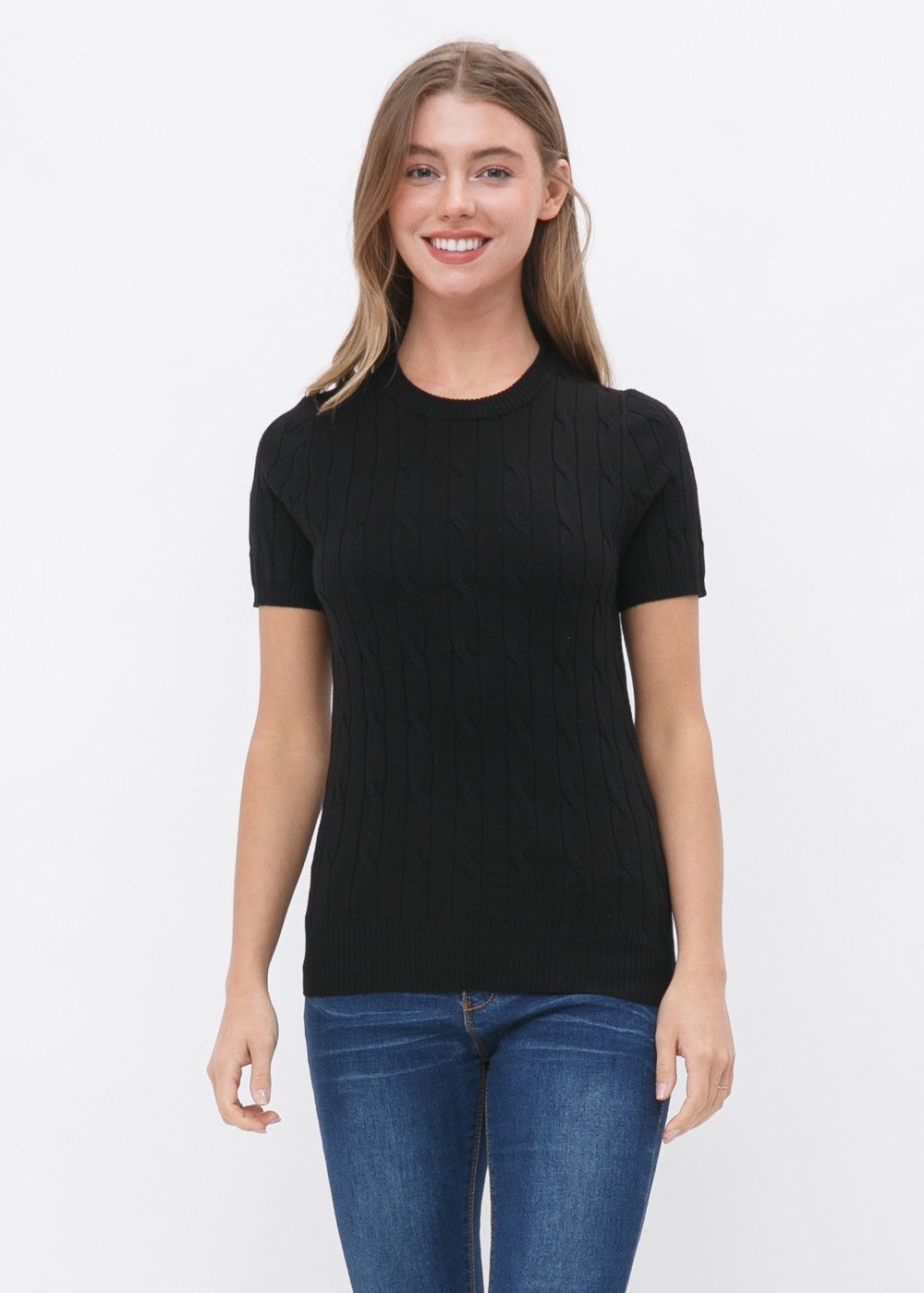 Crew neck Short-Sleeve Twisted Cable Front Design Pullover Sweater.