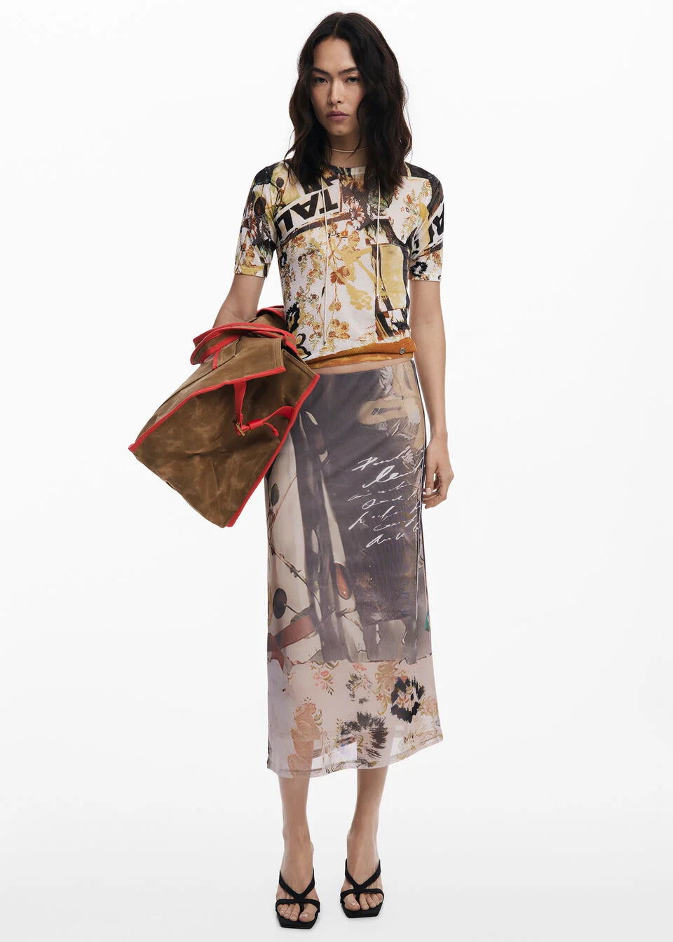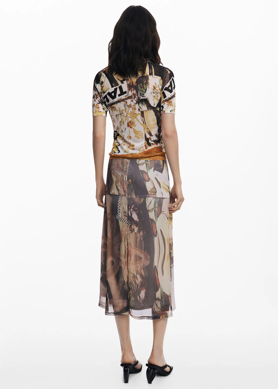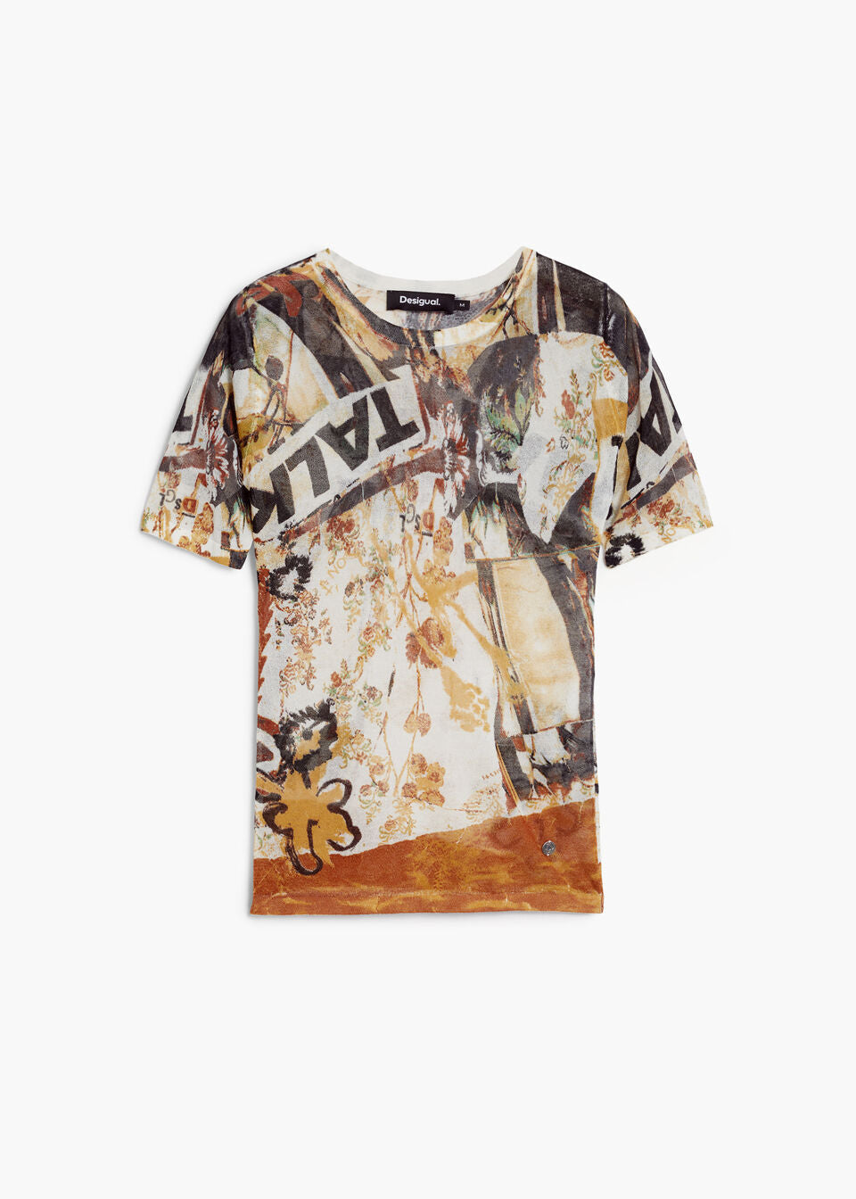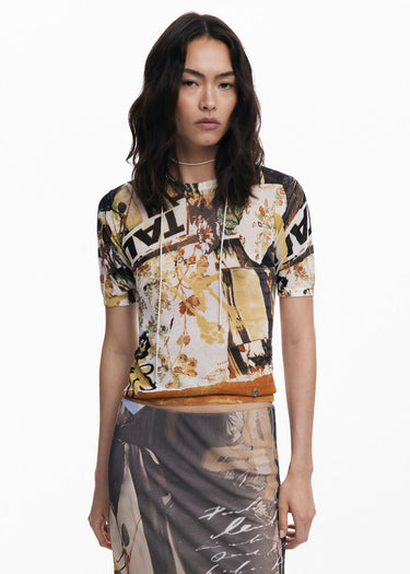 Short-sleeved T-shirt with a round neck in fine knit with ornamental Collage-style print.