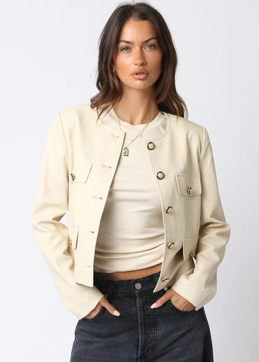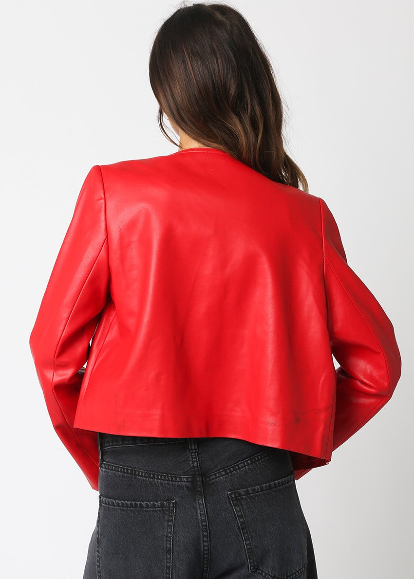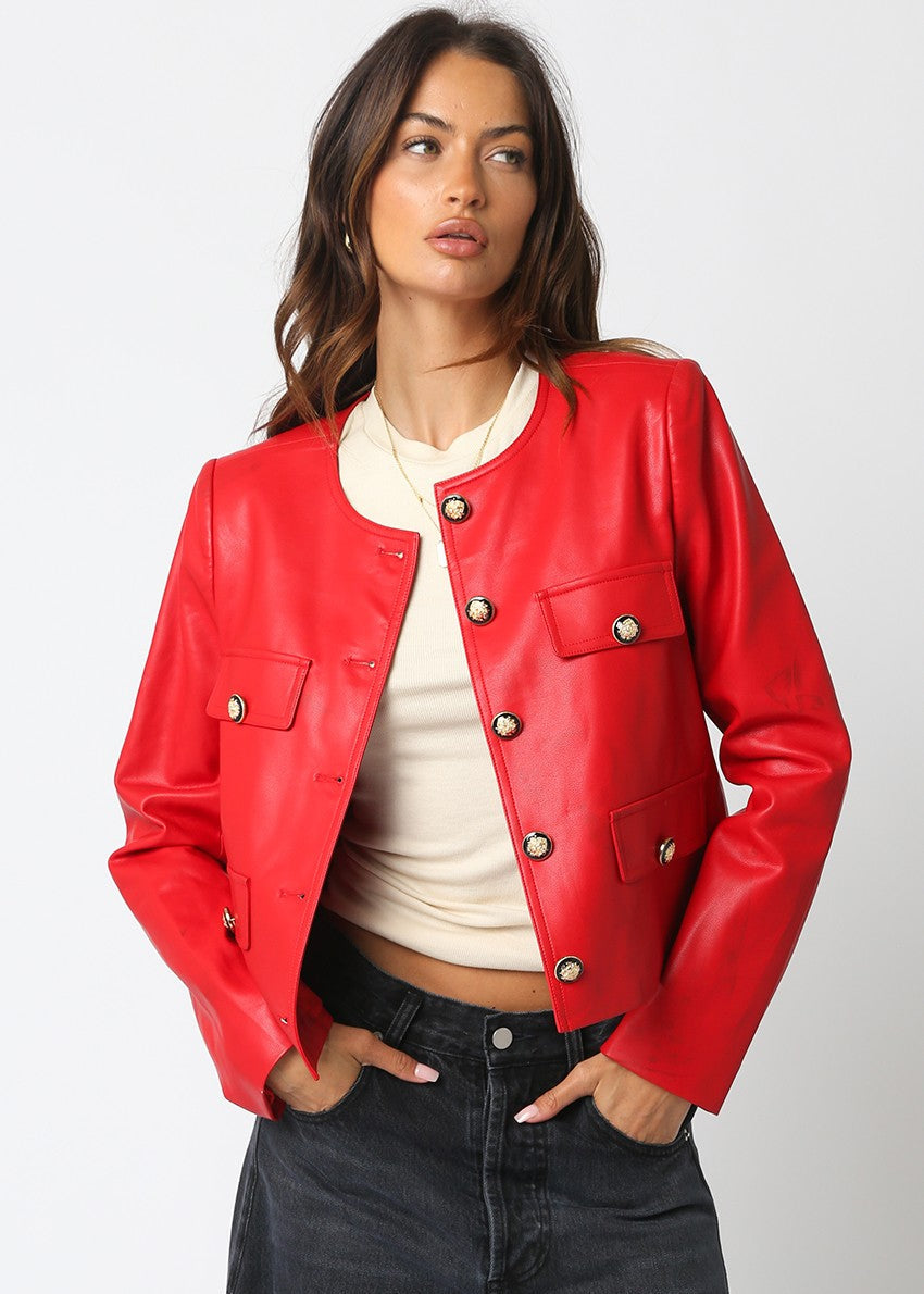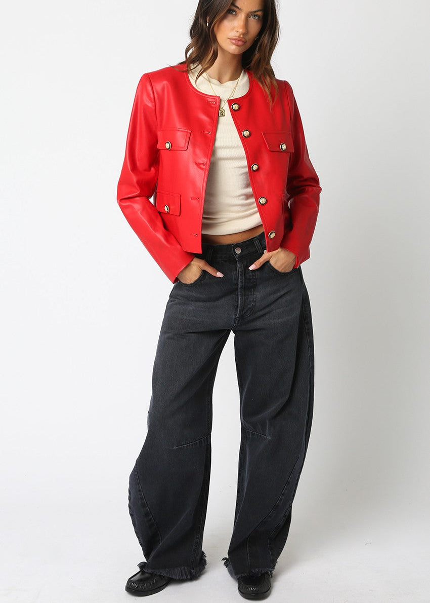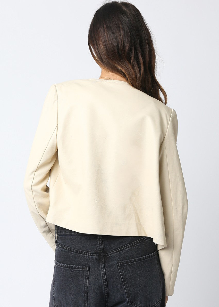 The Dhanna Pu Jacket features a crew neck and a long sleeve