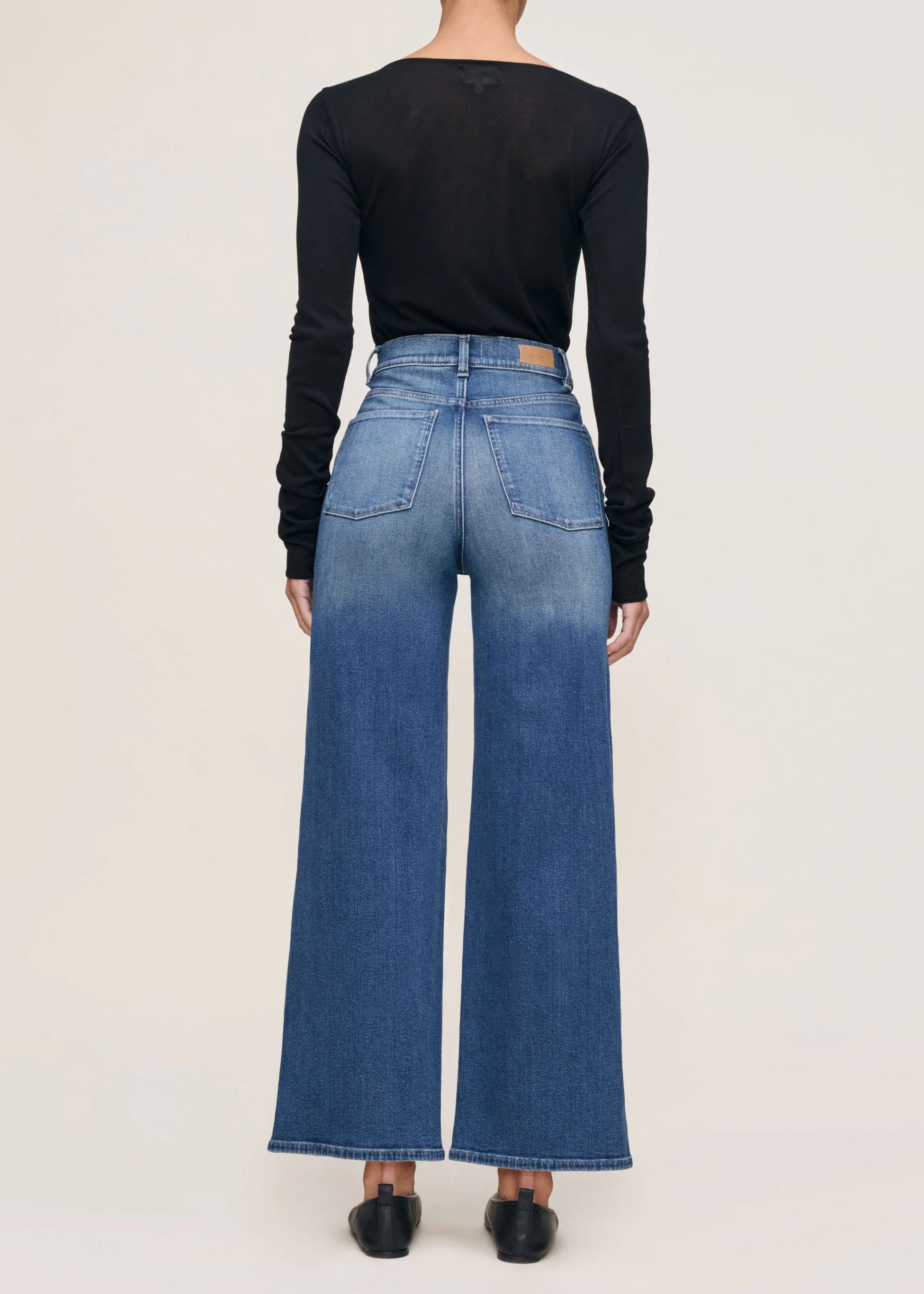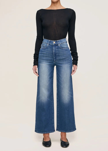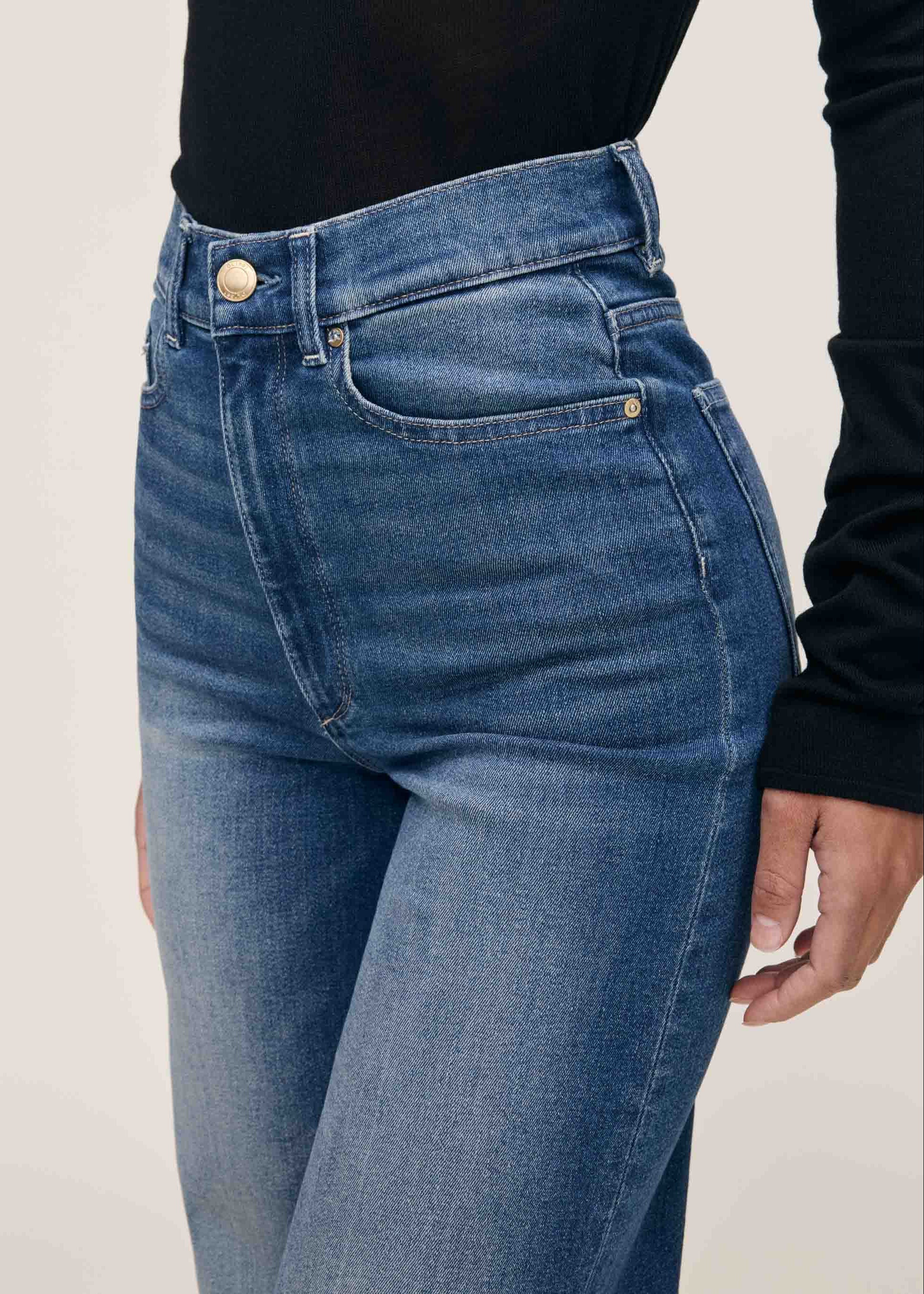 Hepburn is a high-rise style that is fitted through the waist and seat, tapering outward from the thigh for a wide leg that hits above the ankle.
