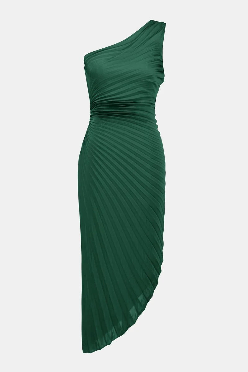 Get ready to shine in this alluring one shoulder dress. Perfect for weddings, cocktail parties, or any special event you attend, this satin dress features a stunning asymetrical hemline with sunburst pleats. Fully lined for added comfort, it falls mid-calf and the silky fabric feels smooth on your skin. You are bound to feel confident and beautiful in this dress all night long.