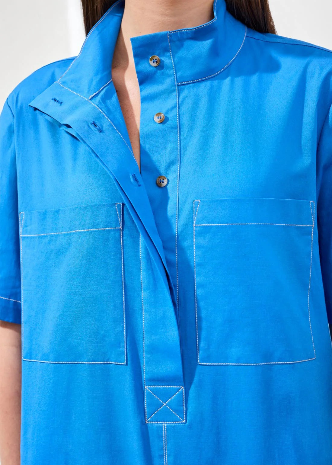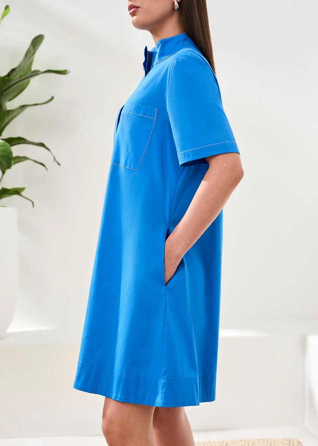 Modern and refine, this short-sleeve A-line shirt dress is crafted from stretch poplin for comfort and ease. A button-front placket, point collar, chest pocket, and side pockets combine polish with practicality, while its above-the-knee length keeps the look fresh and versatile.