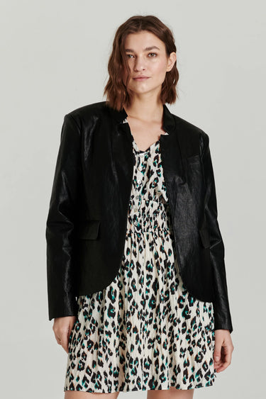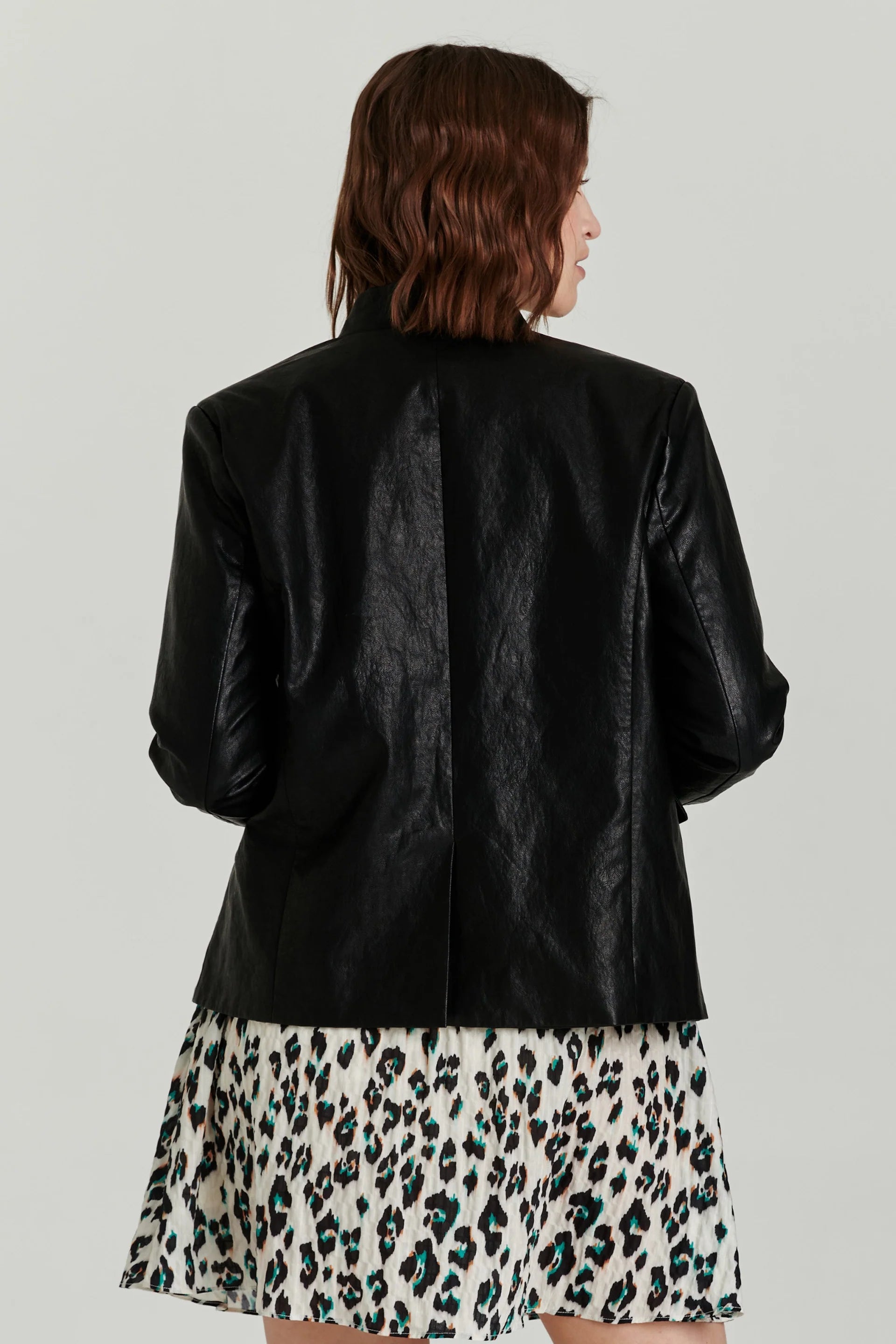 Blazer jacket long sleeve, flap pockets in faux leather body with lapel, stand collar & center back slit. Ever versatile, perfect blend of chic or formal! Solid color faux leather on standard fit.